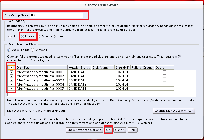 1.8.2.2. 「FRA」DiskGroupの作成(作業サーバー:RAC1)¶