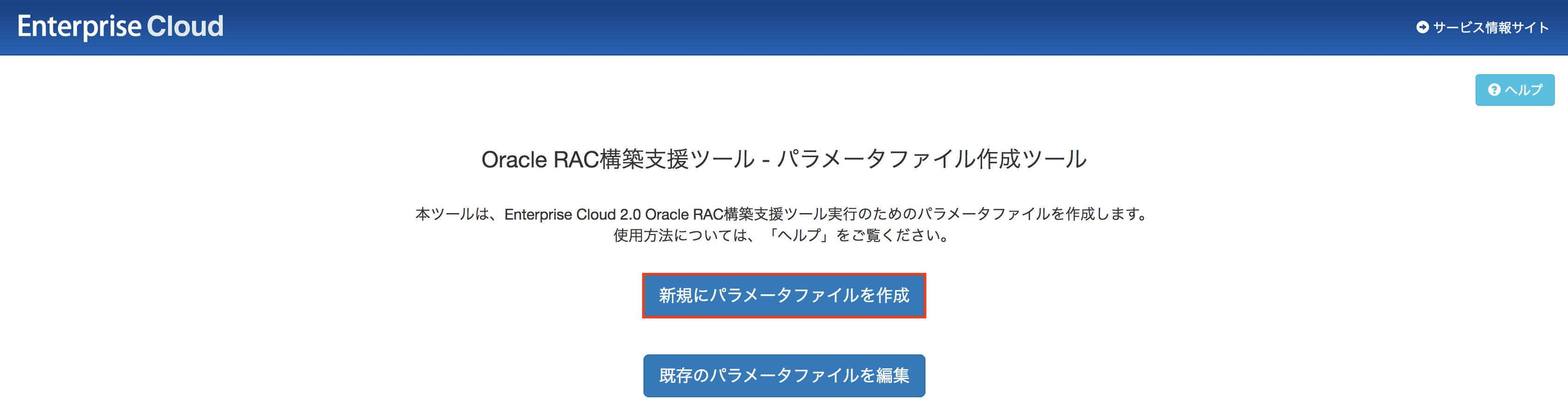 [Oracle RAC構築支援ツール-パラメータファイル作成ツール]画面のトップページが表示された後、[新規にパラメータファイルを作成]ボタンをクリックします。