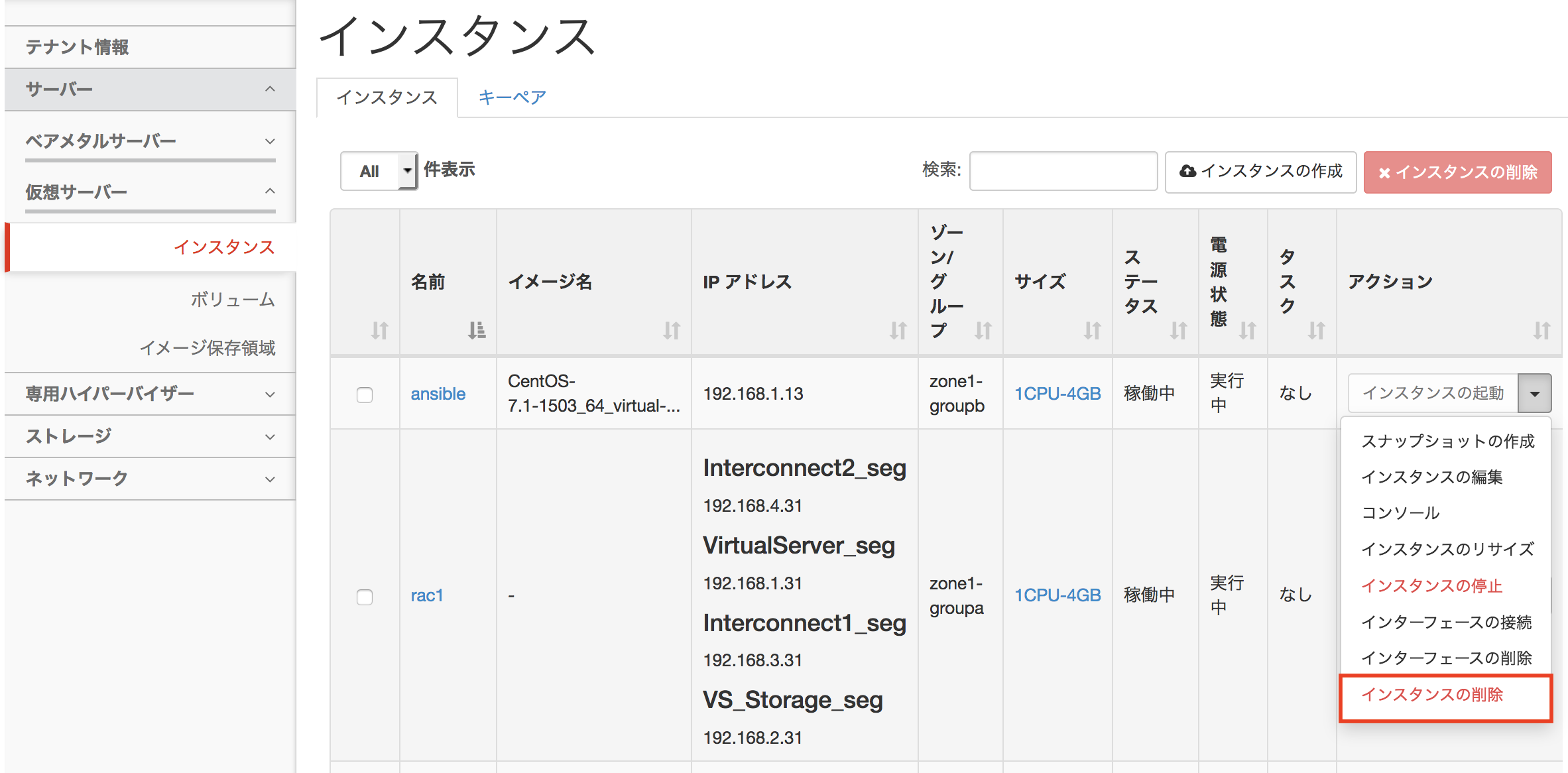 [サーバーインスタンス] > [インスタンス]へ移動し、Ansible実行用サーバーインスタンスのアクションリストから[インスタンスの削除]をクリックします。