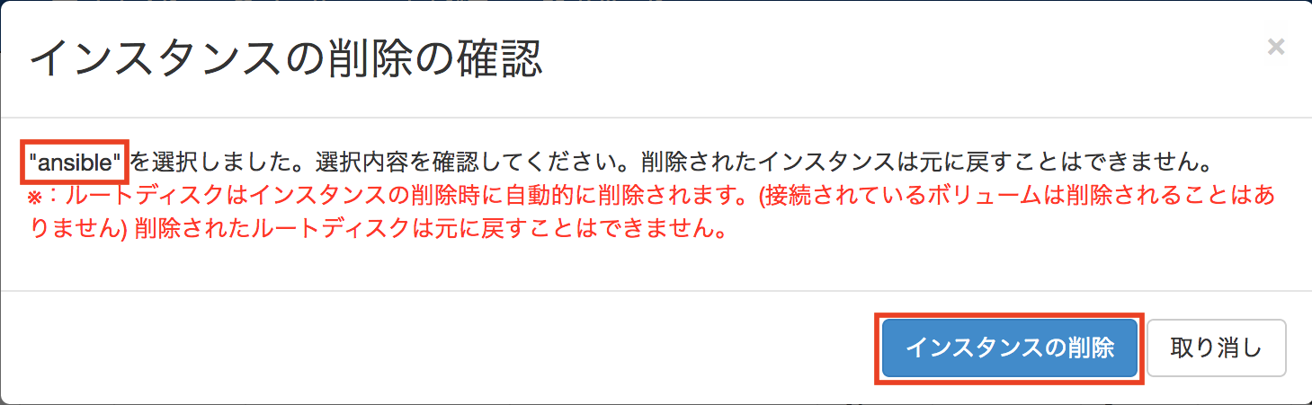 インスタンスの削除の確認画面に遷移後、対象サーバーインスタンスで正しいか確認し、[インスタンスの削除]をクリックします。