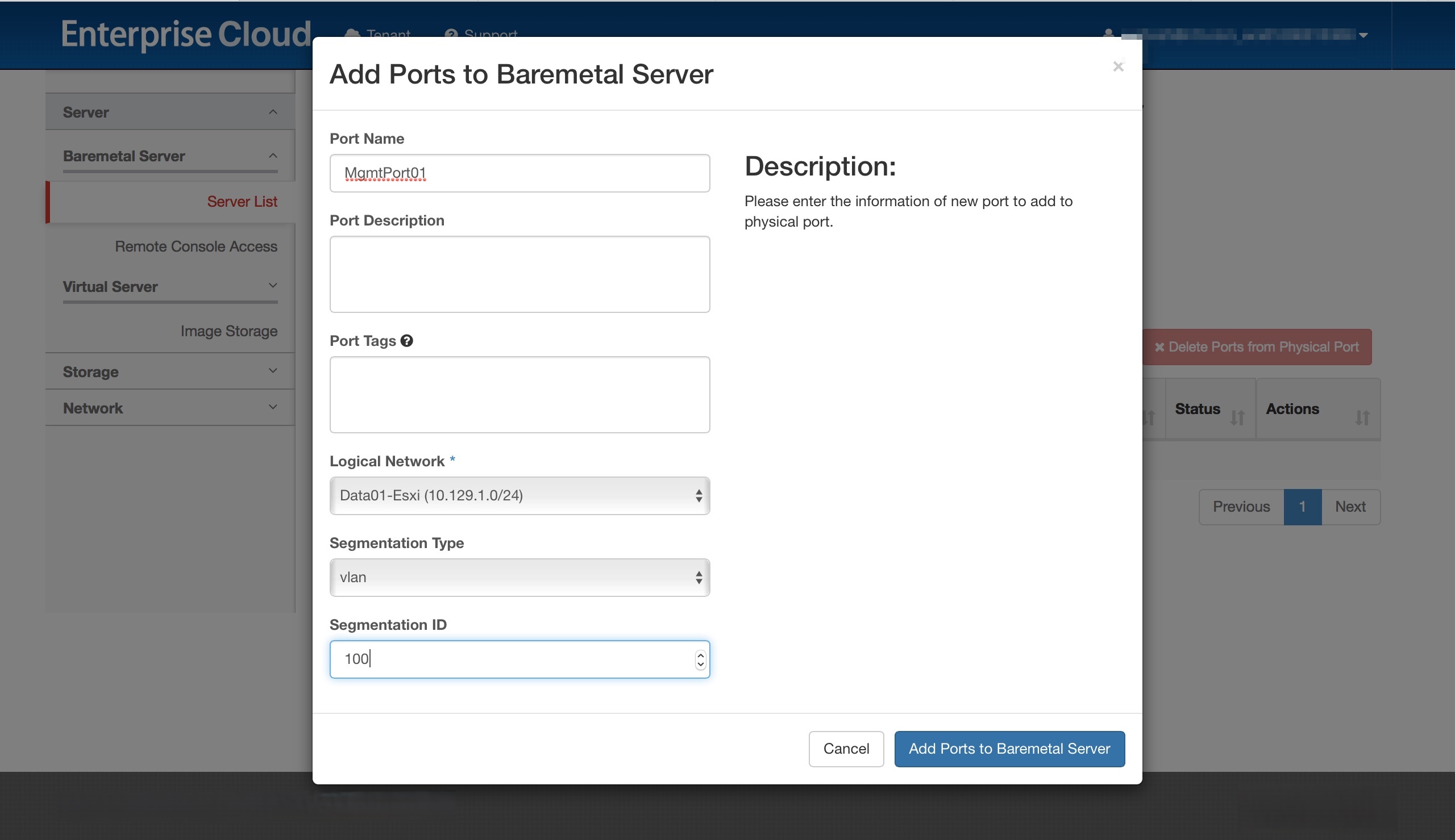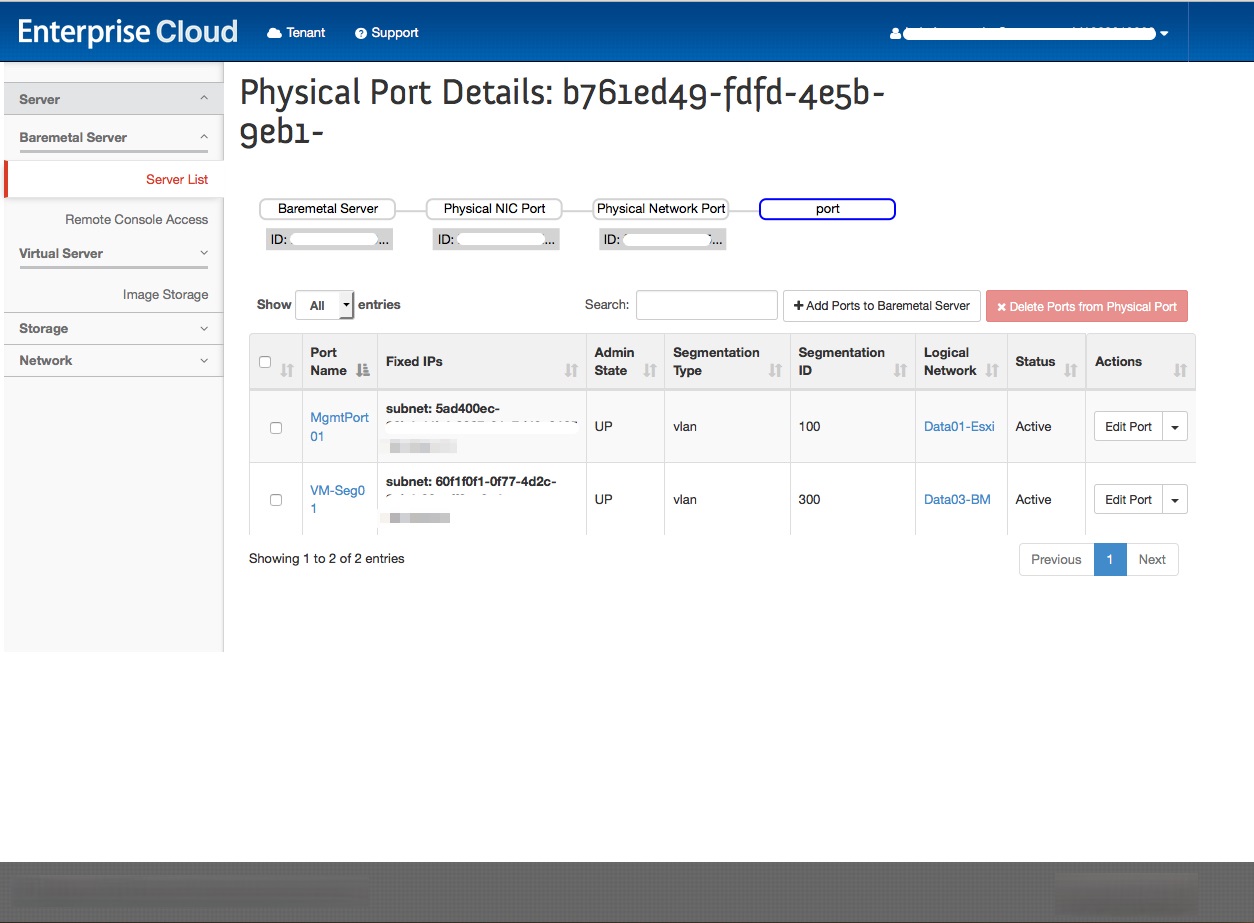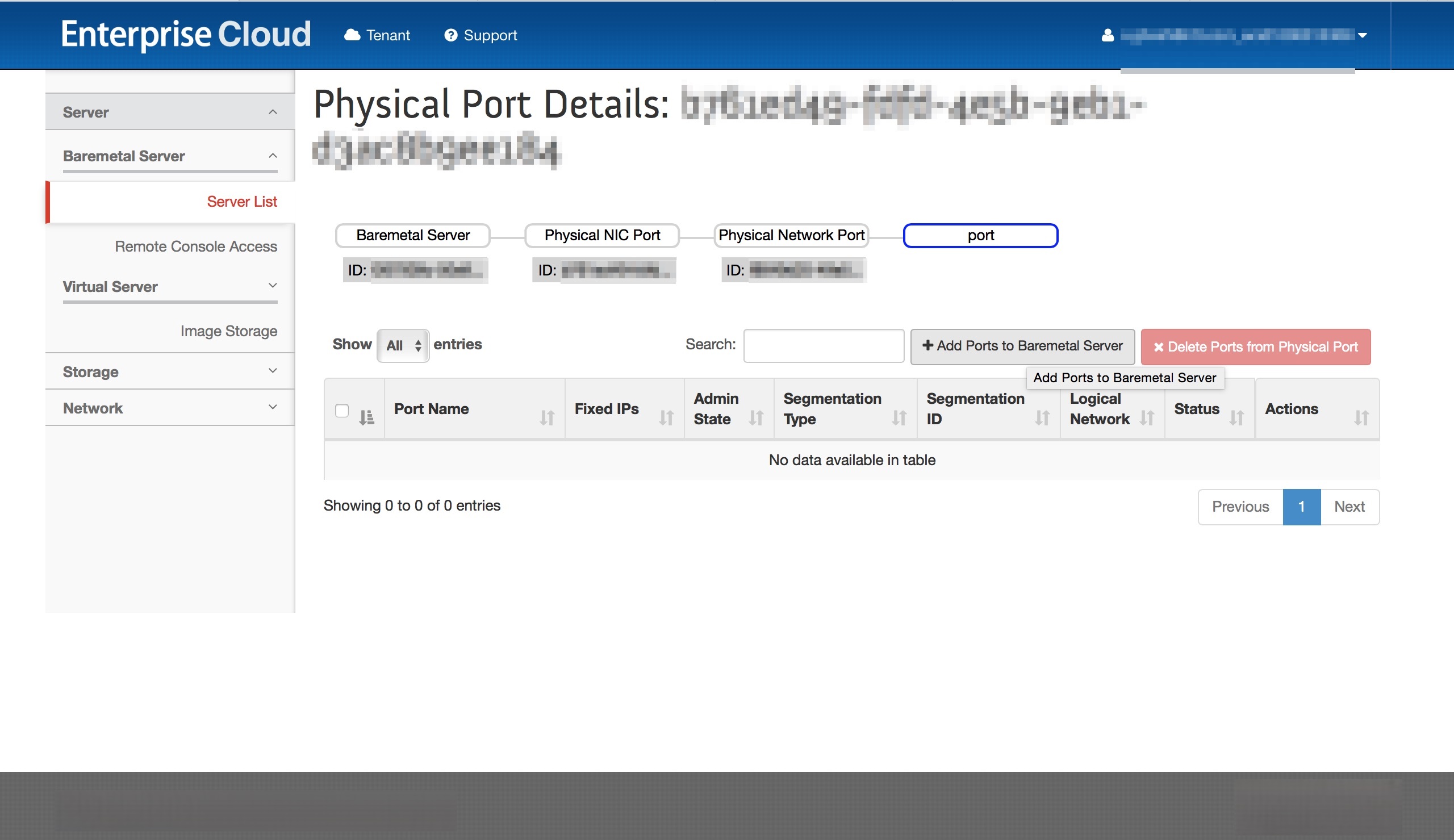ベアメタルサーバーメニューで作成されるロジカルネットワークのポートはセグメントIDが3で設定されます。 セグメントIDを変更するために、ポートを削除し、当該ロジカルネットワークに新たなポートを作成します。