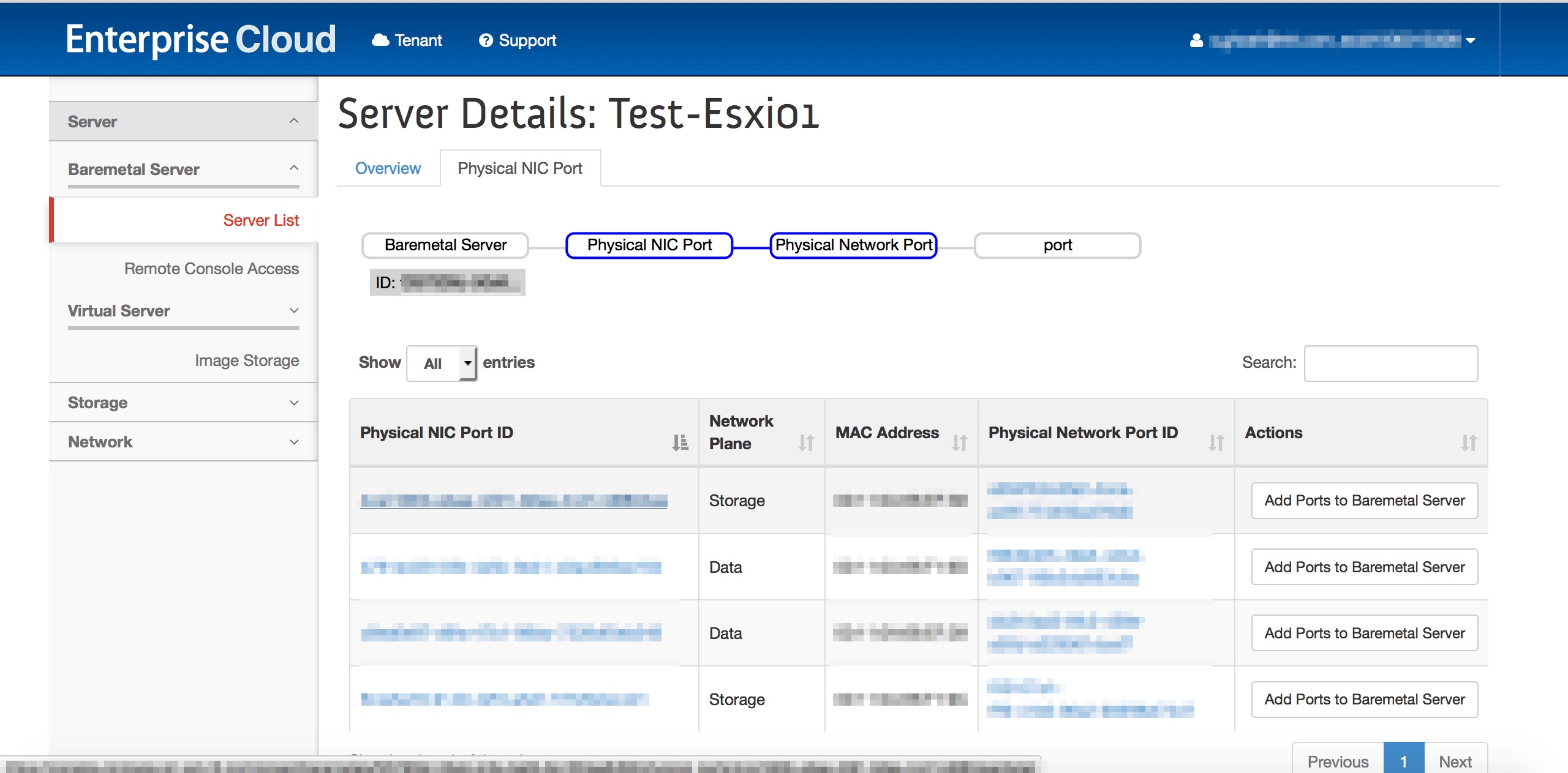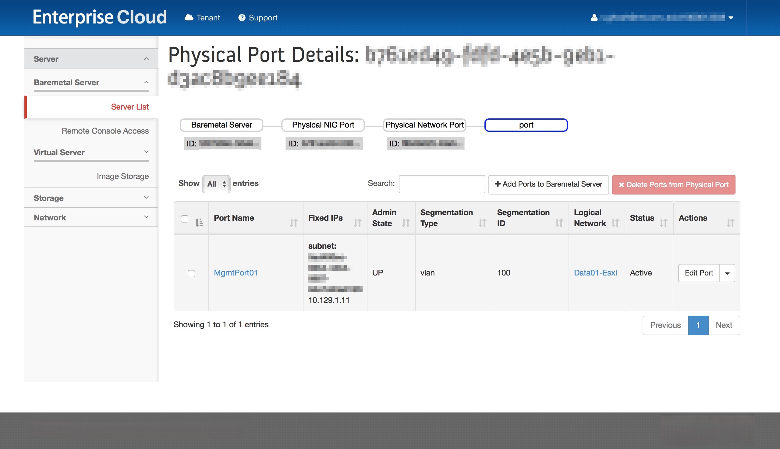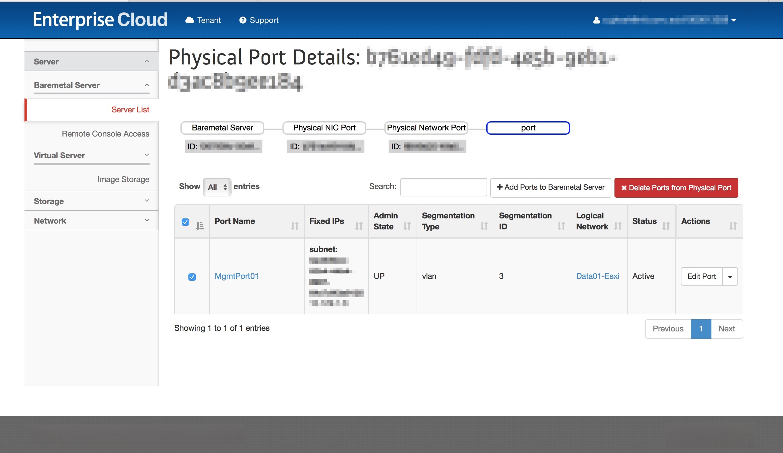 ベアメタルサーバーメニューで作成されるロジカルネットワークのポートはセグメントIDが3で設定されます。 セグメントIDを変更するために、ポートを削除し、当該ロジカルネットワークに新たなポートを作成します。