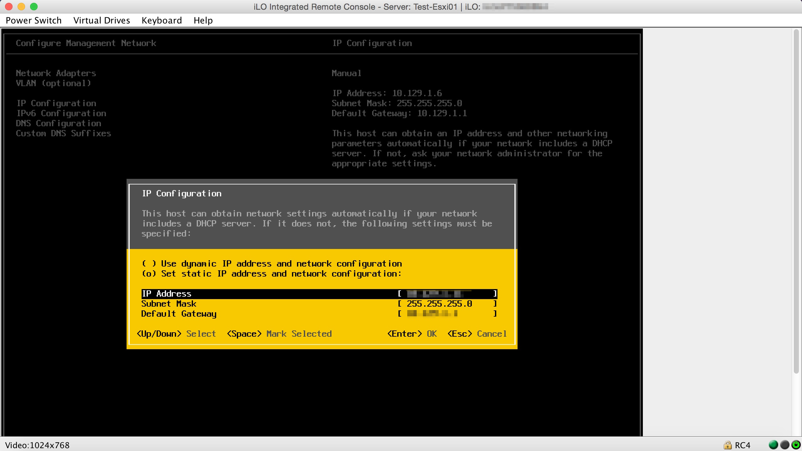 ロジカルネットワークの設定に合わせ、ESXiのネットワーク設定を変更します。 ここでは、セグメントID(vlan)とIPアドレスの画面を例示します。