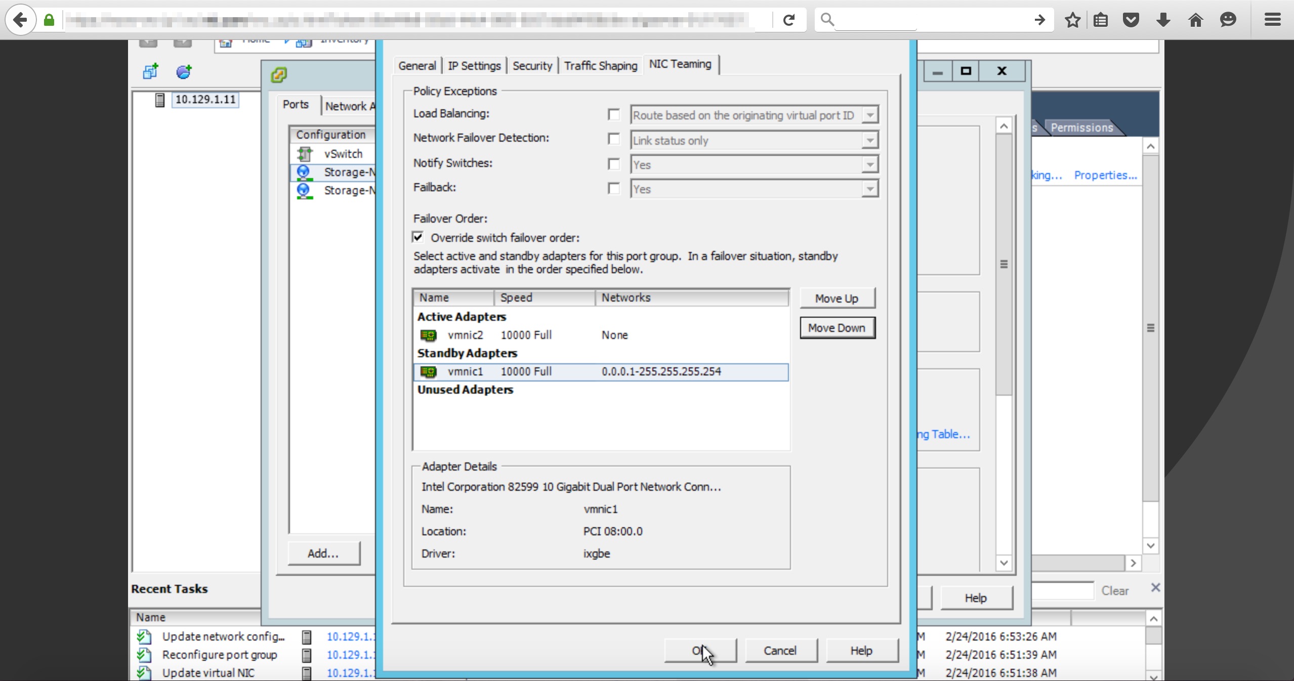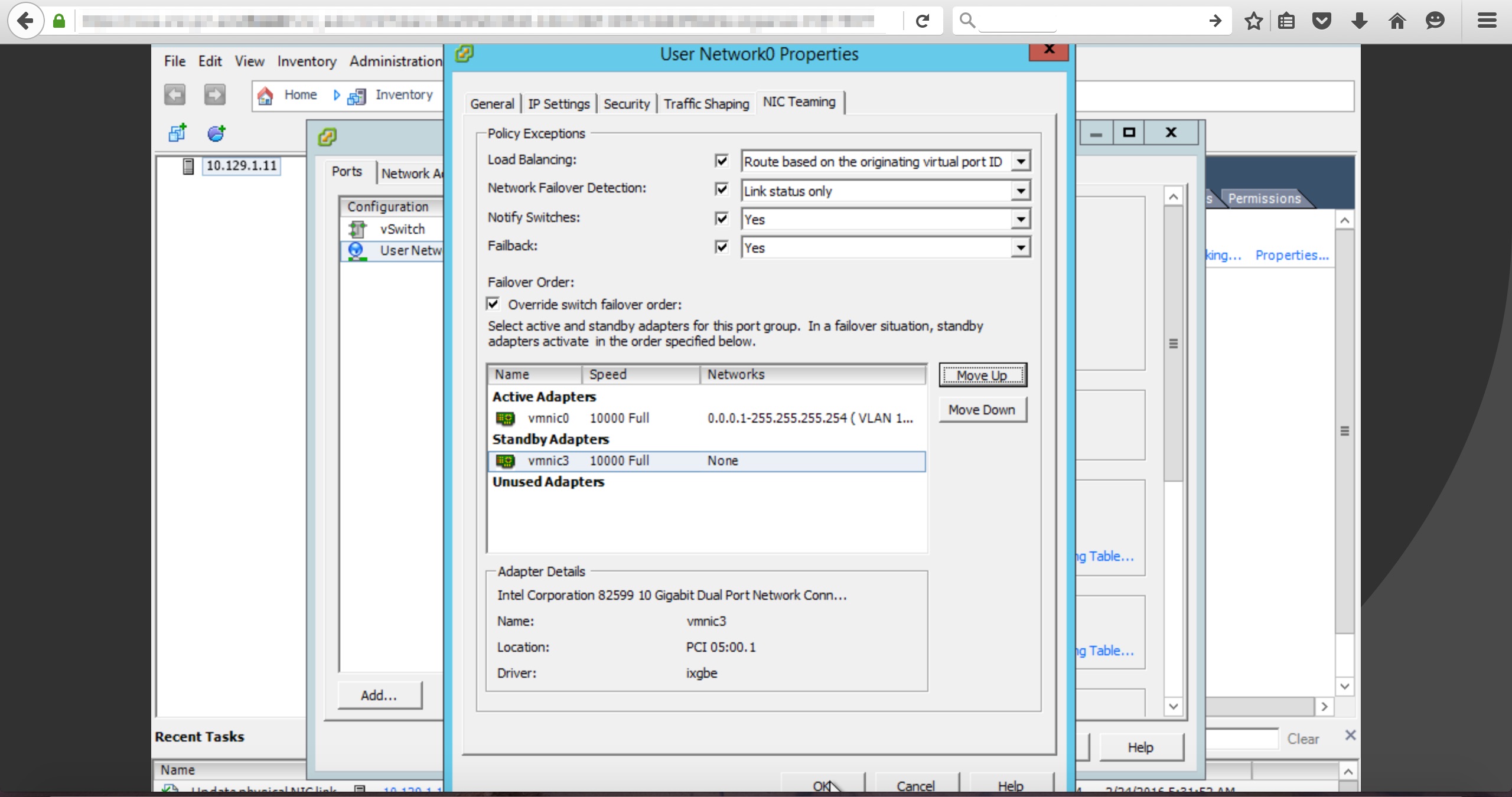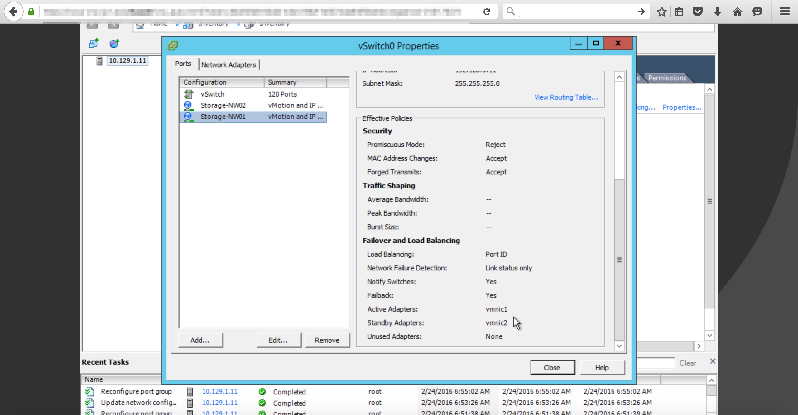 上記設定は下記各VMkernelインターフェースのチーミング設定画面にて実施します。