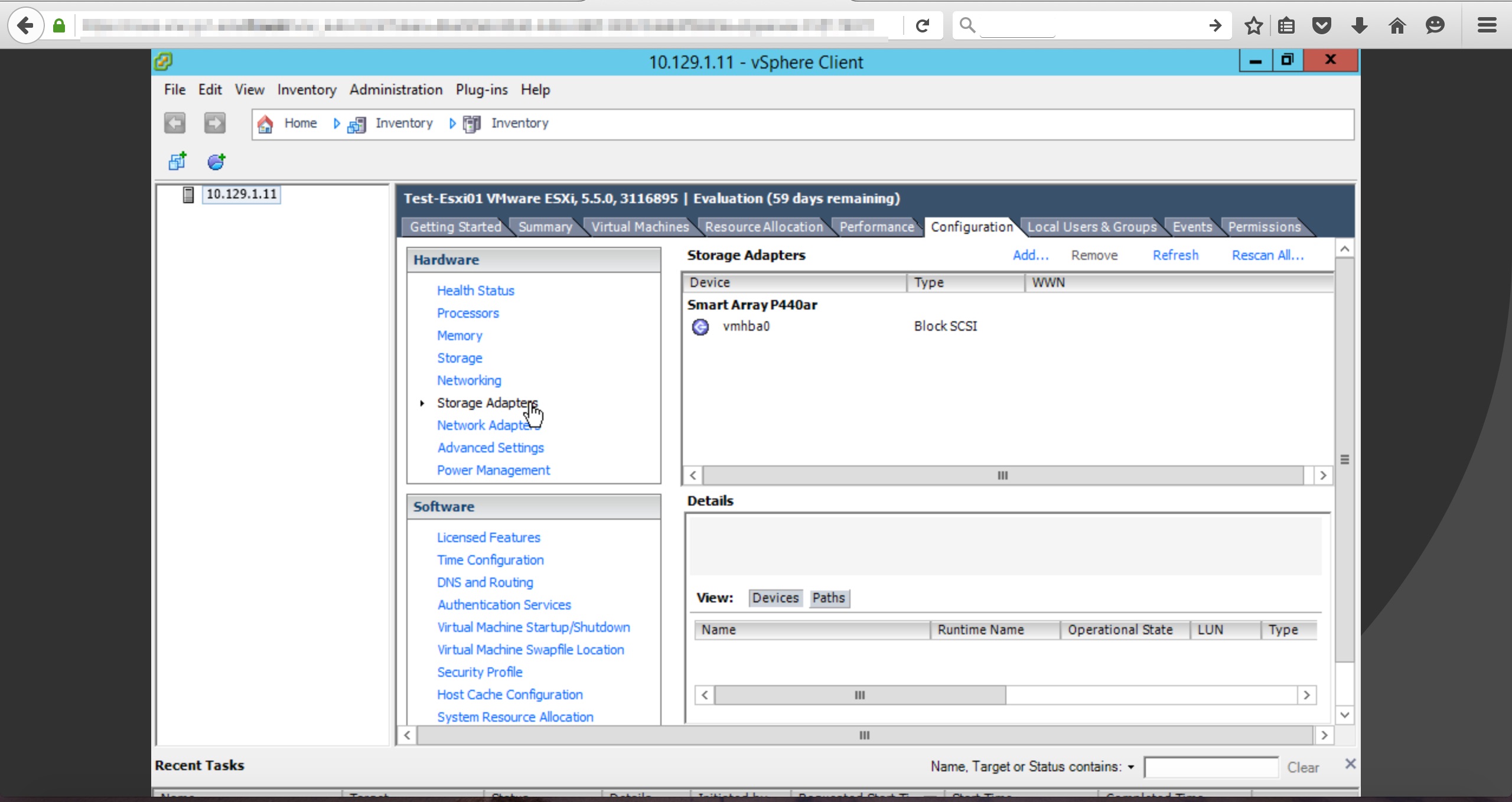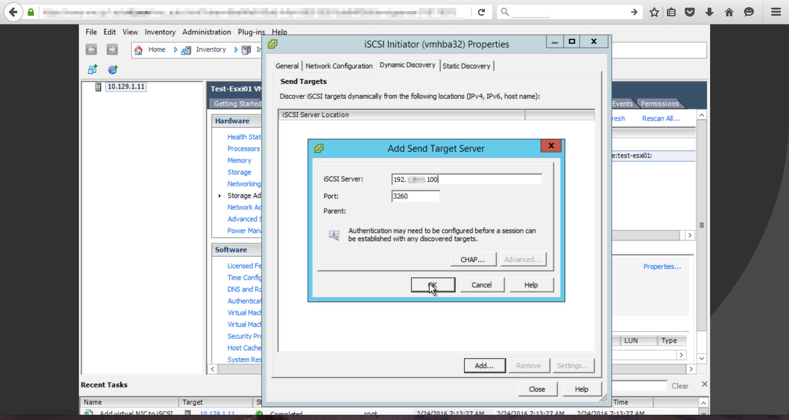 vSphereClientからVMware ESXi機能であるソフトウェアiSCSIアダプタを有効化します。