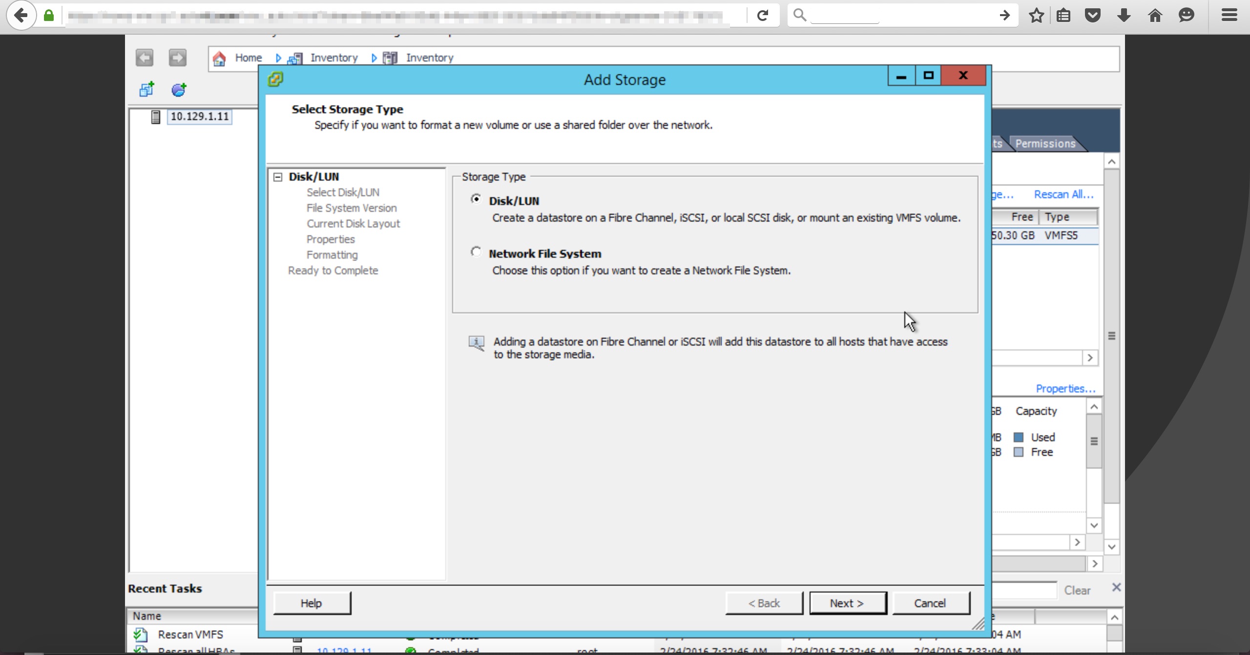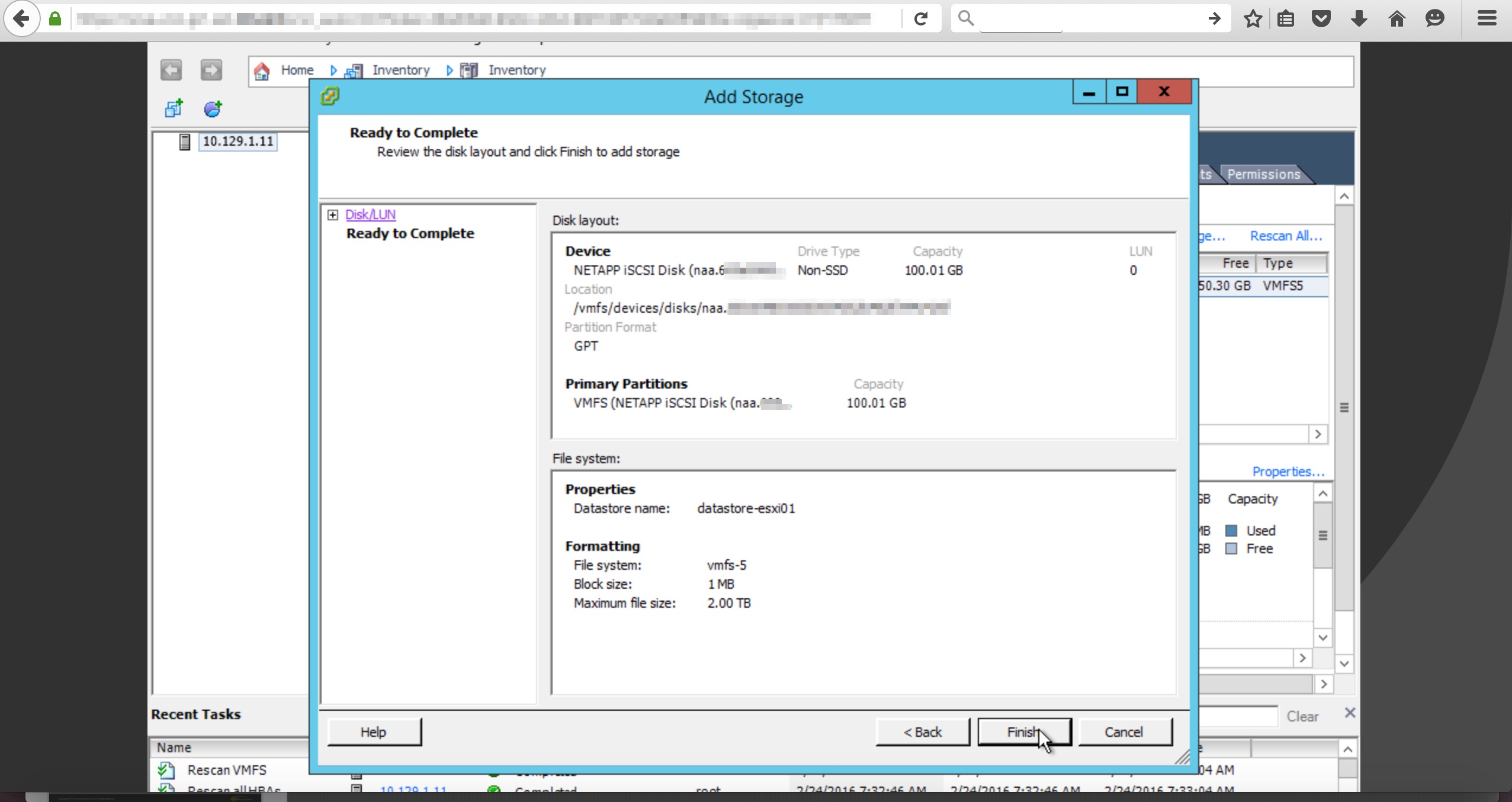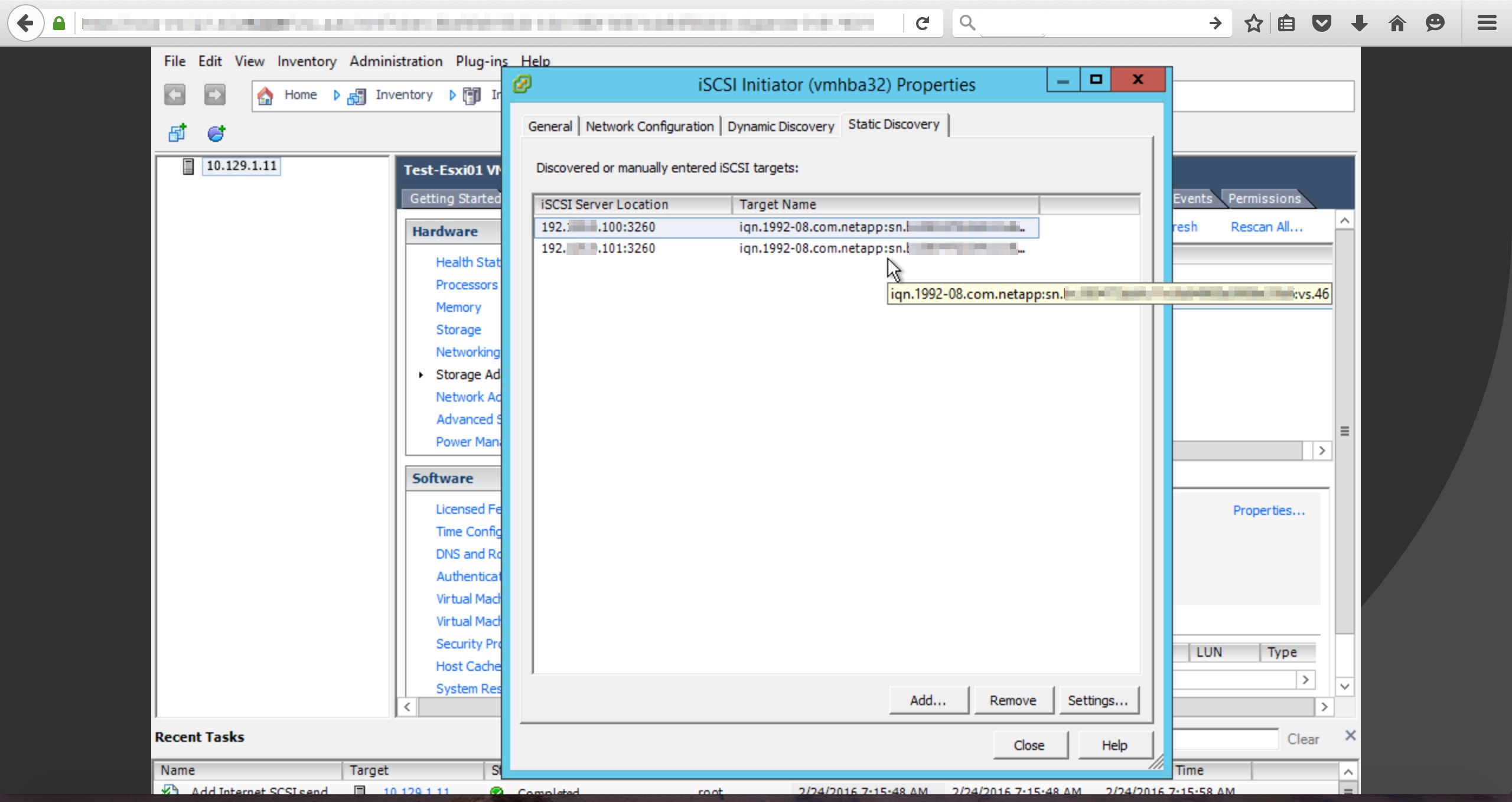 - 事前に作成したブロックストレージのLUNをターゲットとしたiSCSIイニシエーターを設定します。設定後、ESXiのStorage Adapters設定画面から、ストレージをマウントします。