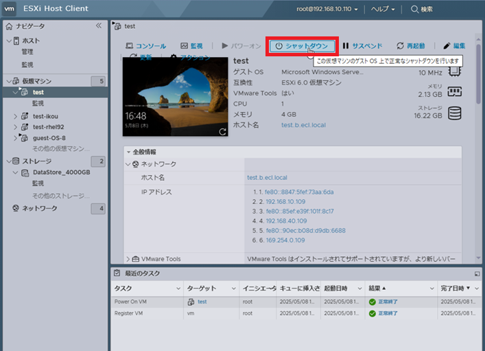 - vSphere ESXi仮想マシンが正しく起動せず、シャットダウン操作ができない場合は、「パワーオフ」をクリックします。