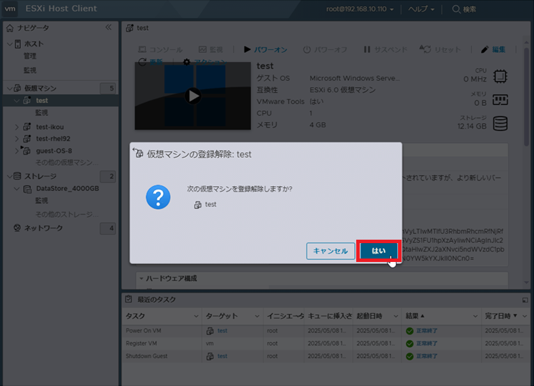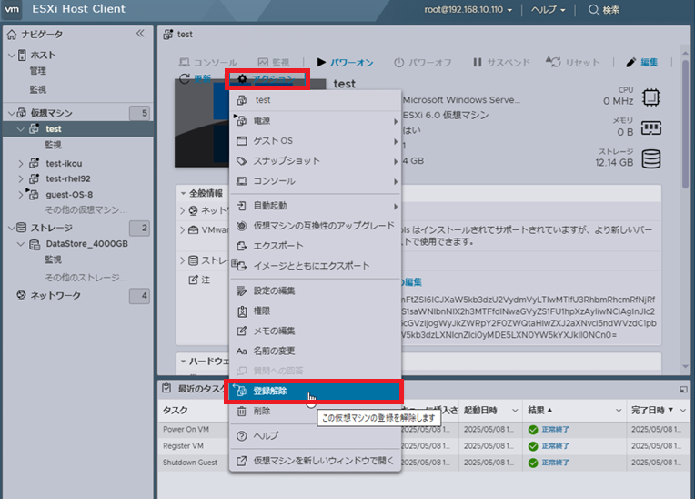 本作業を、vSphere ESXi 8.0(移行先)上でインベントリの登録解除が必要な仮想マシンの台数分実施します。