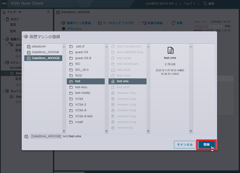 対象の仮想マシンの実体データを選択し、「登録」をクリックします。