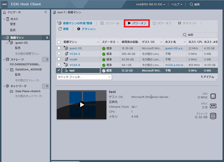 一覧に表示された対象の仮想マシンを選択し、「パワーオン」をクリックします。