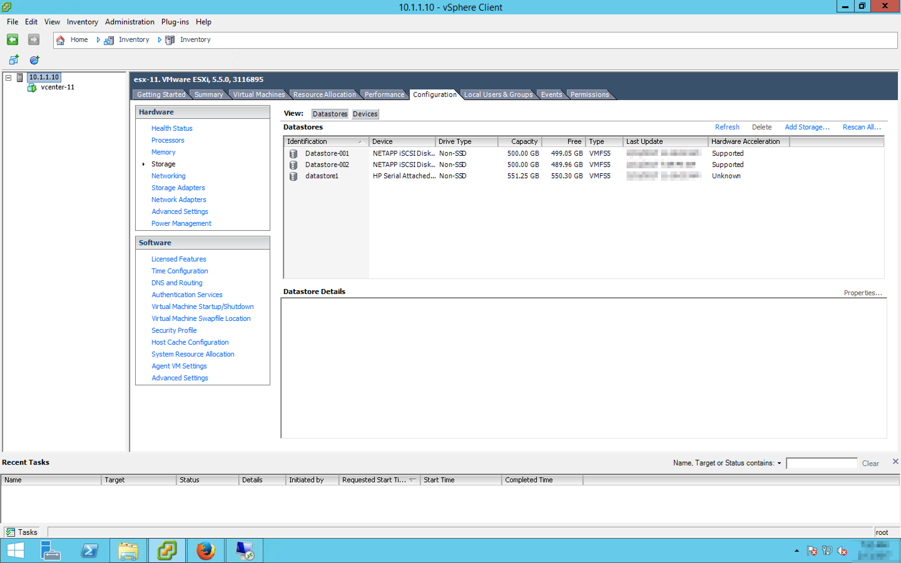 • vSphere Client にて対象となる [Configuration]タブ 左ペインの [Hardware] > [Storage] をクリックします。