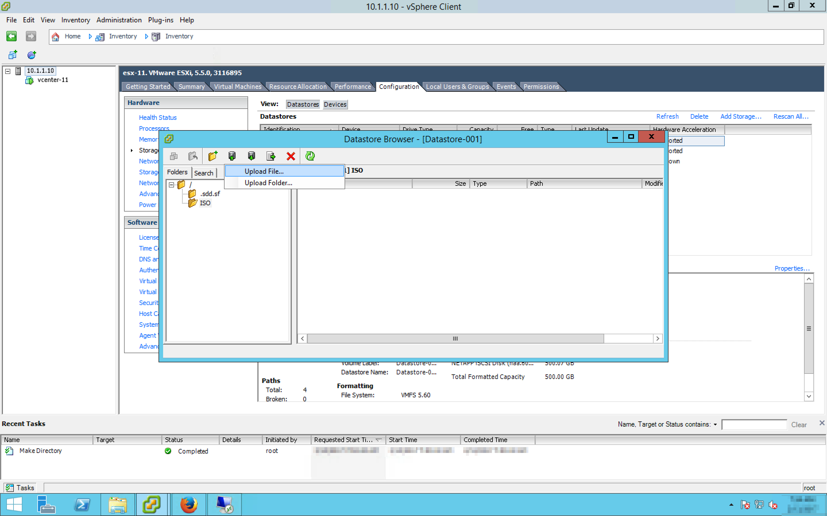 • 作成されたフォルダをクリック、[Upload files to this datastore]をクリックし、[Upload File...]をクリックします。