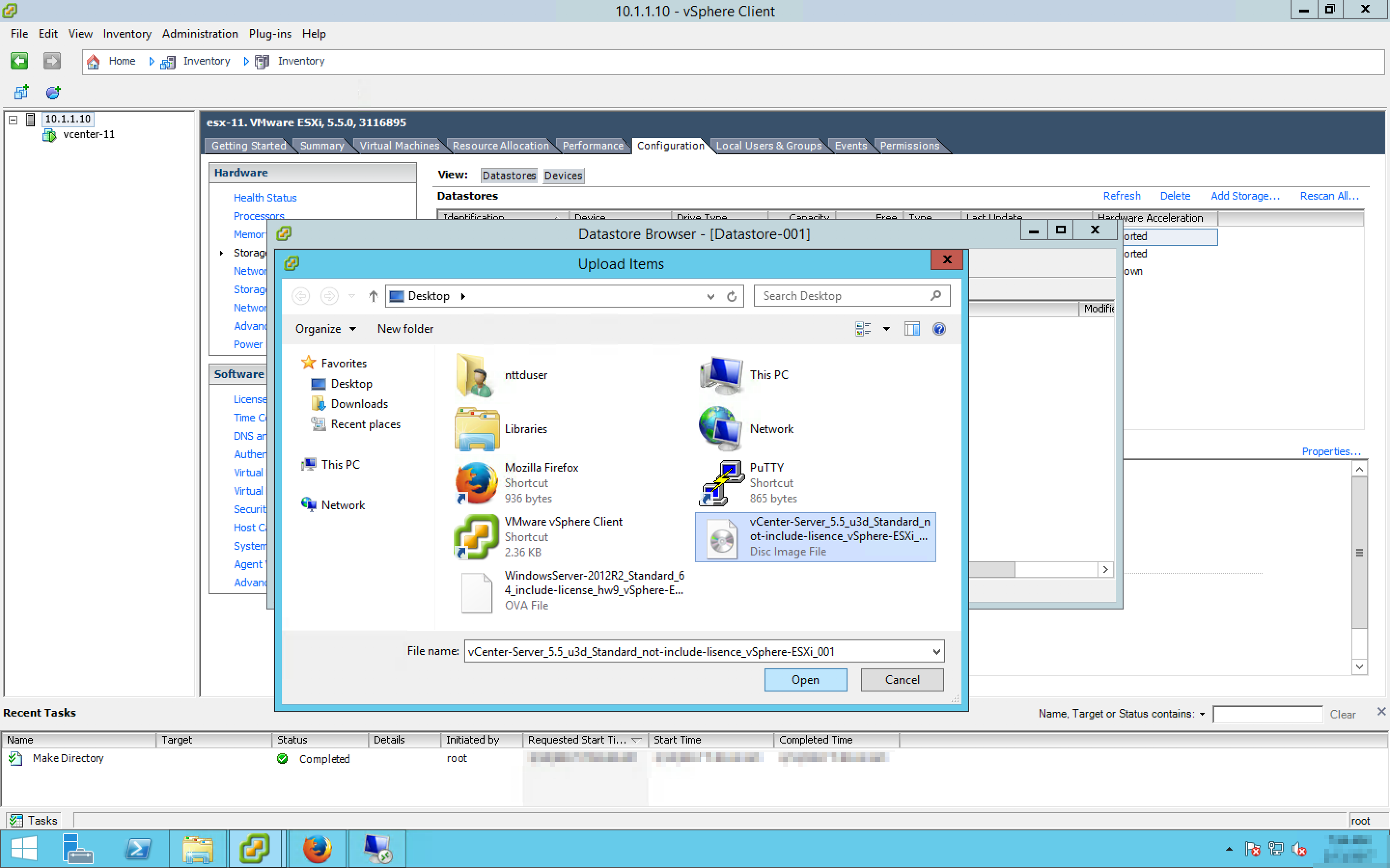 • [Upload Items]ダイアログ にてデスクトップ上に置いた VMware vCenter Installer の ISOイメージを選択し、[Open]をクリックします。