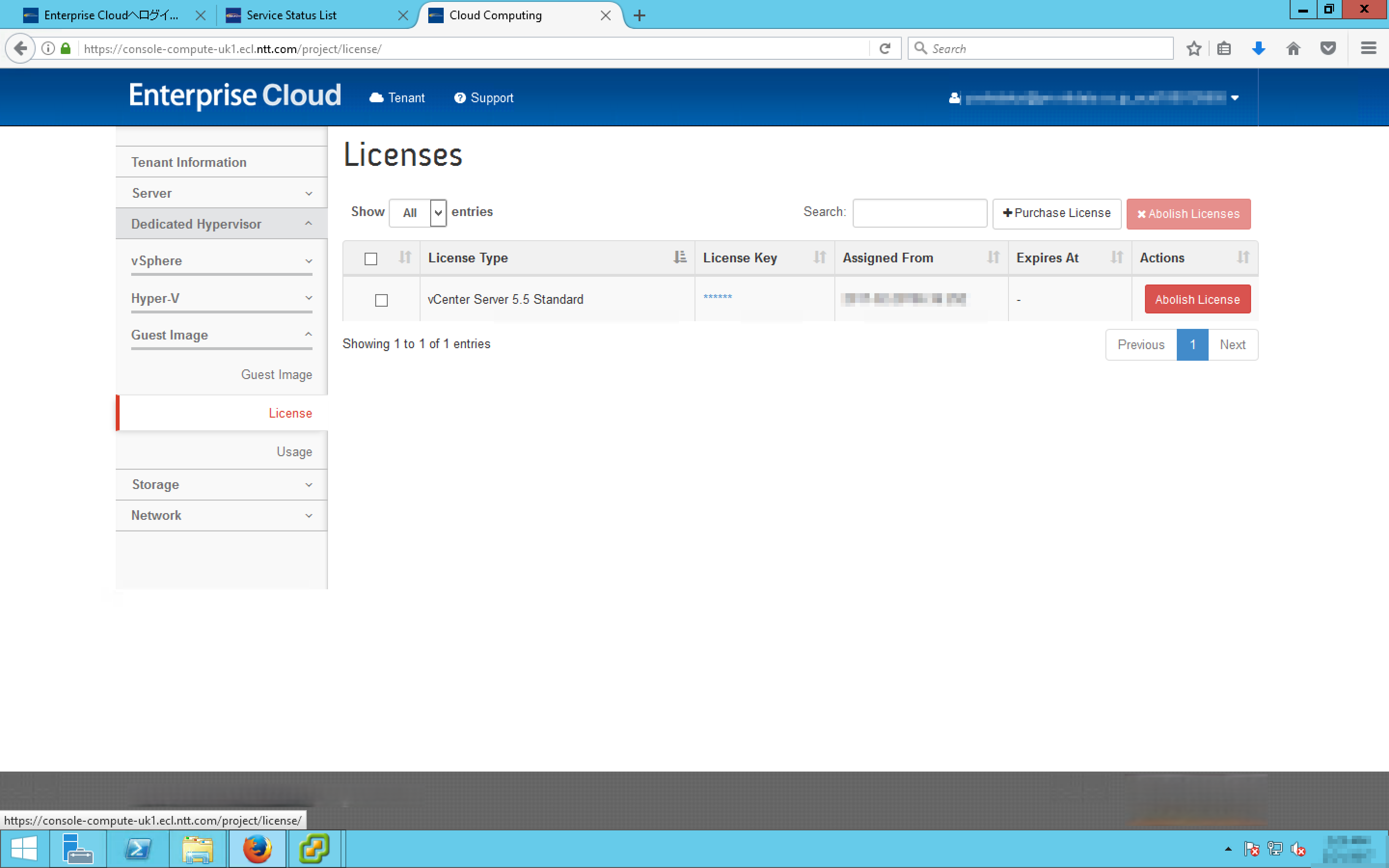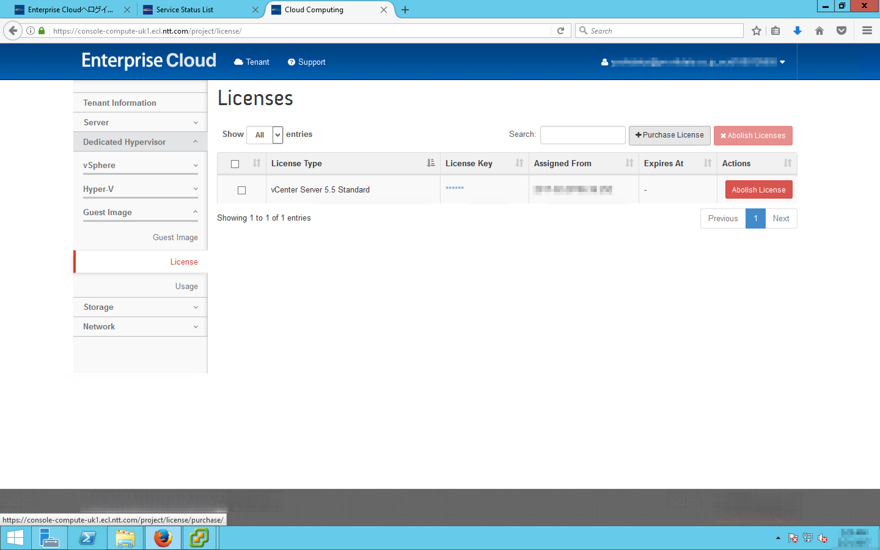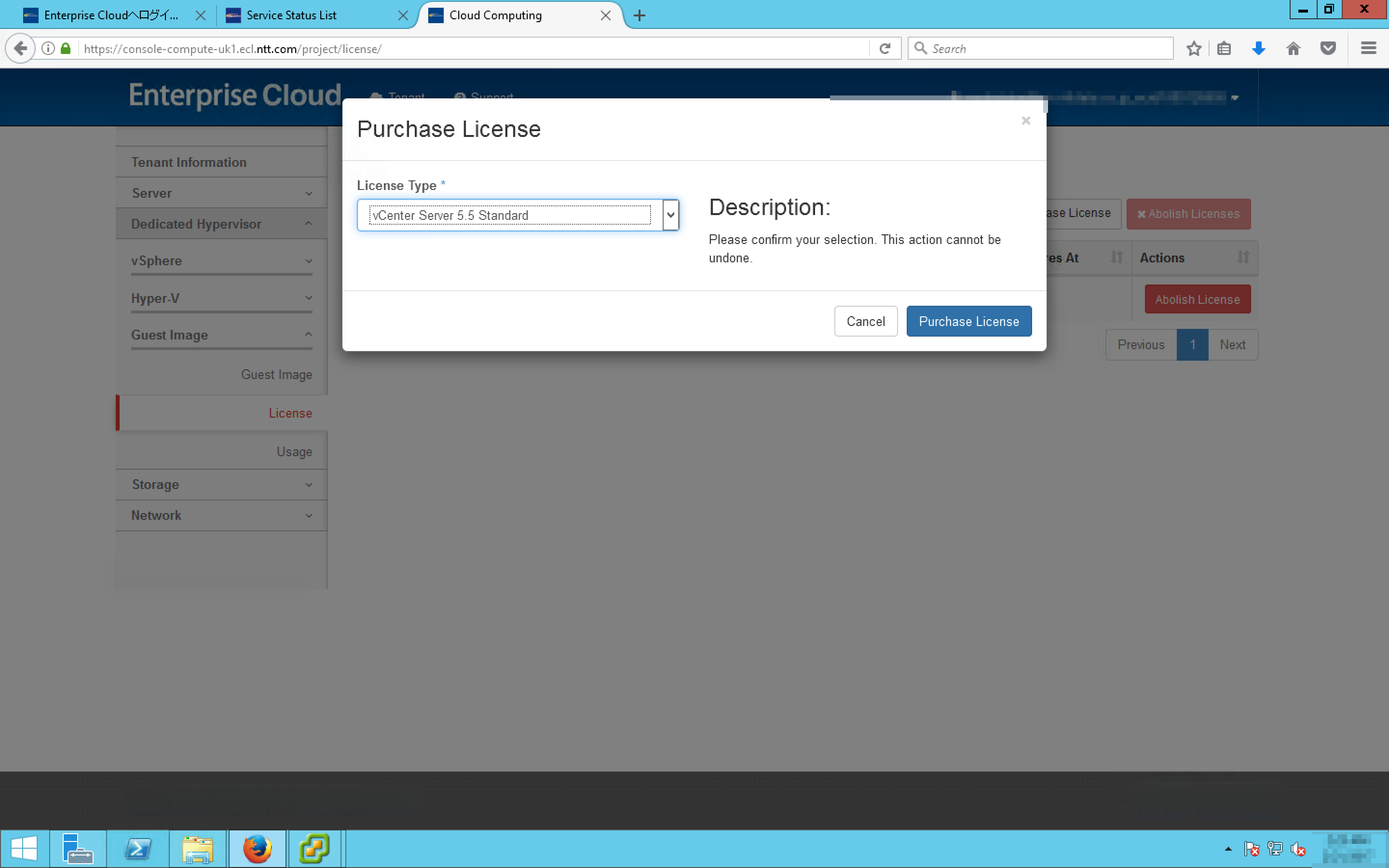 • Webブラウザにて [Cloud Computing Control Panel] 左ペインの [Dedicated Hypervisor] > [Guest Image] を開き、[License] をクリックします。