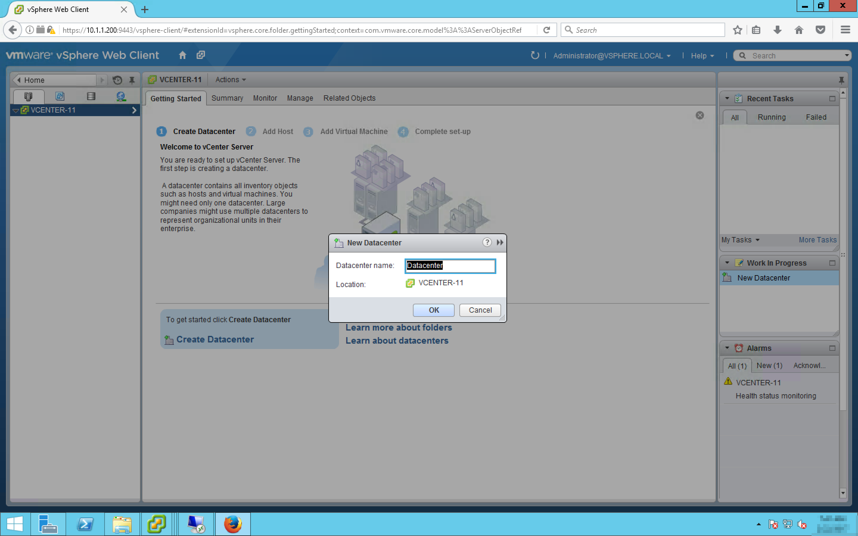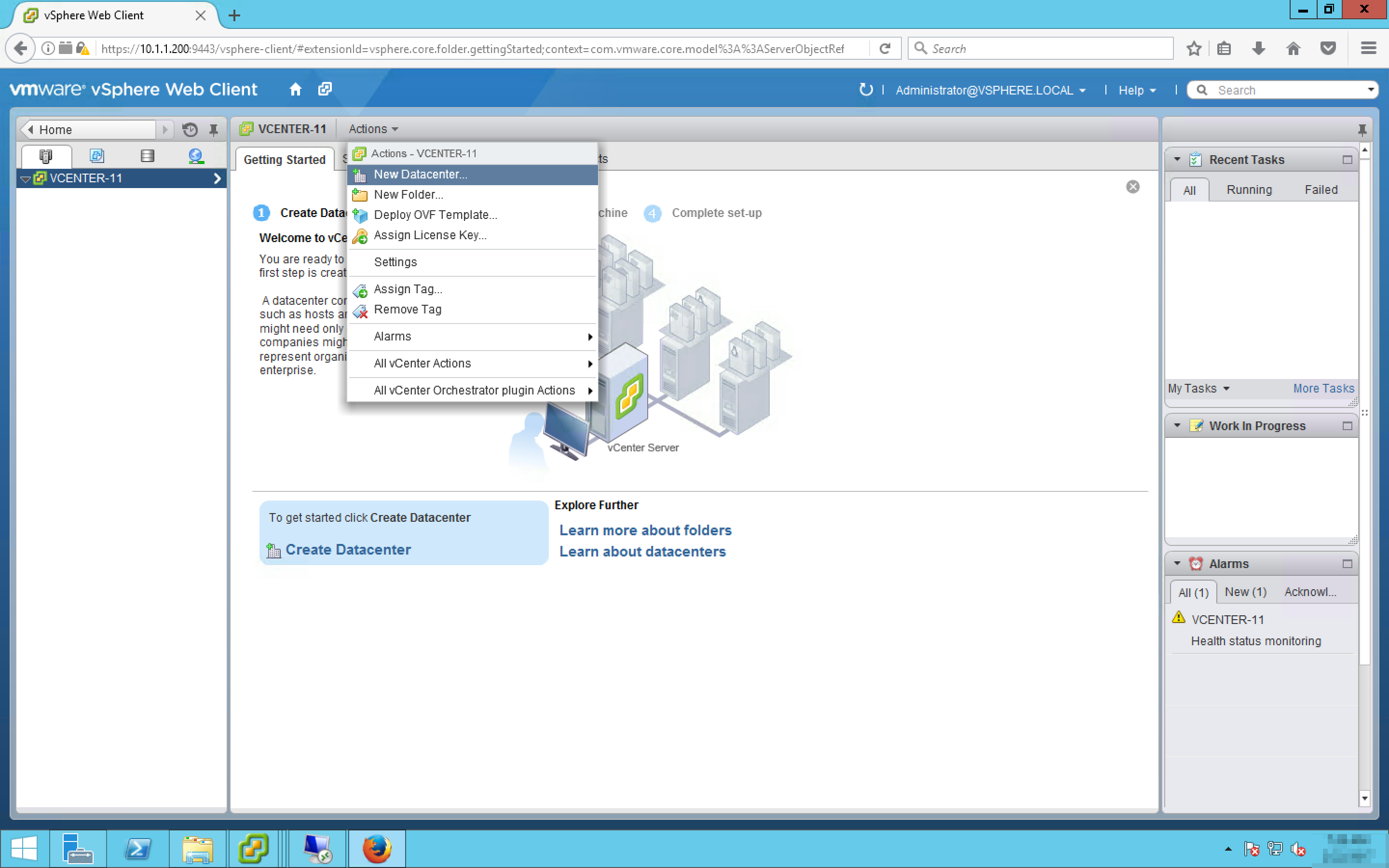 • 左ペインにある vCenter Server のアイコンをクリックし、 画面上部の [Action] > [New Datacenter] をクリックします。