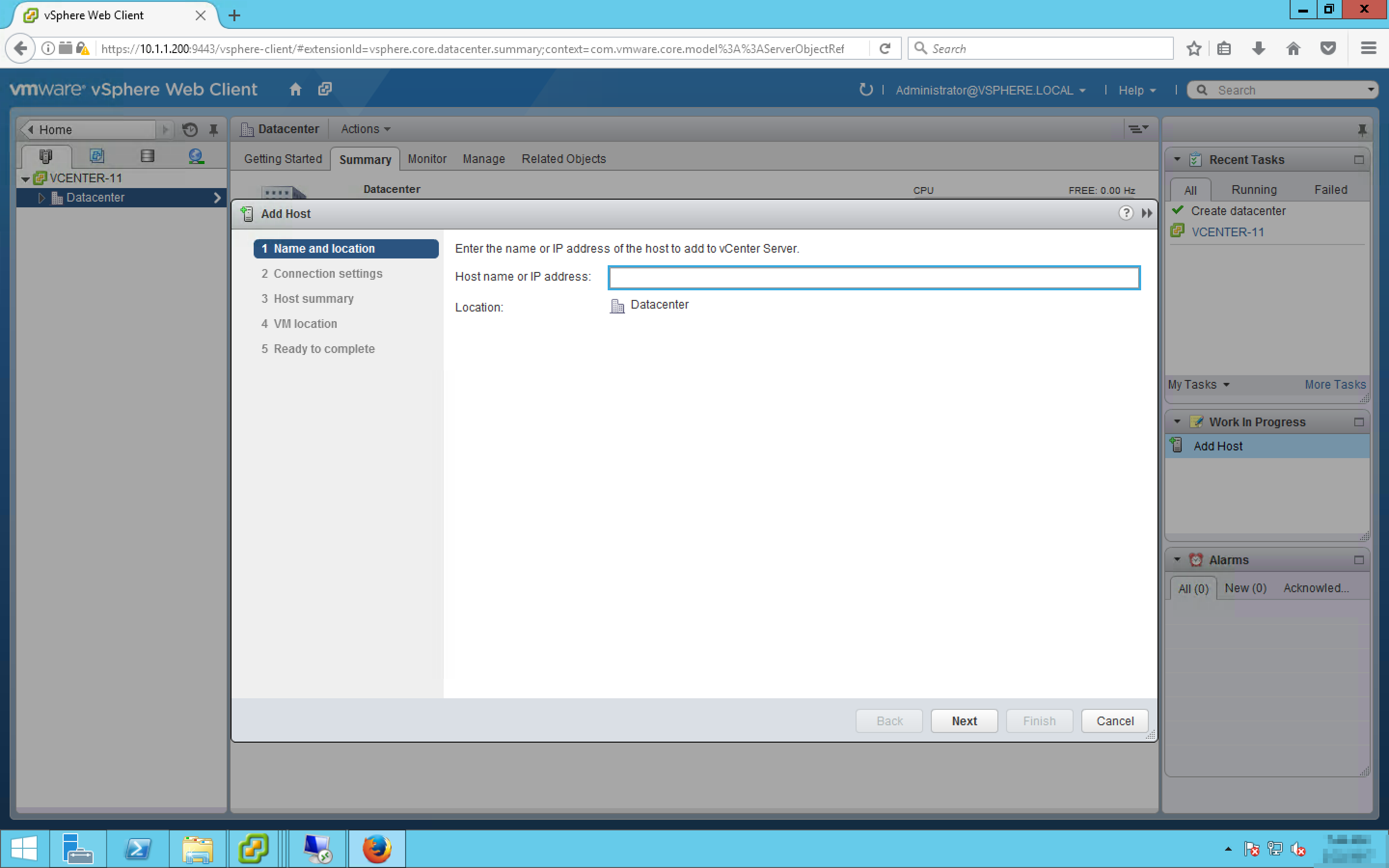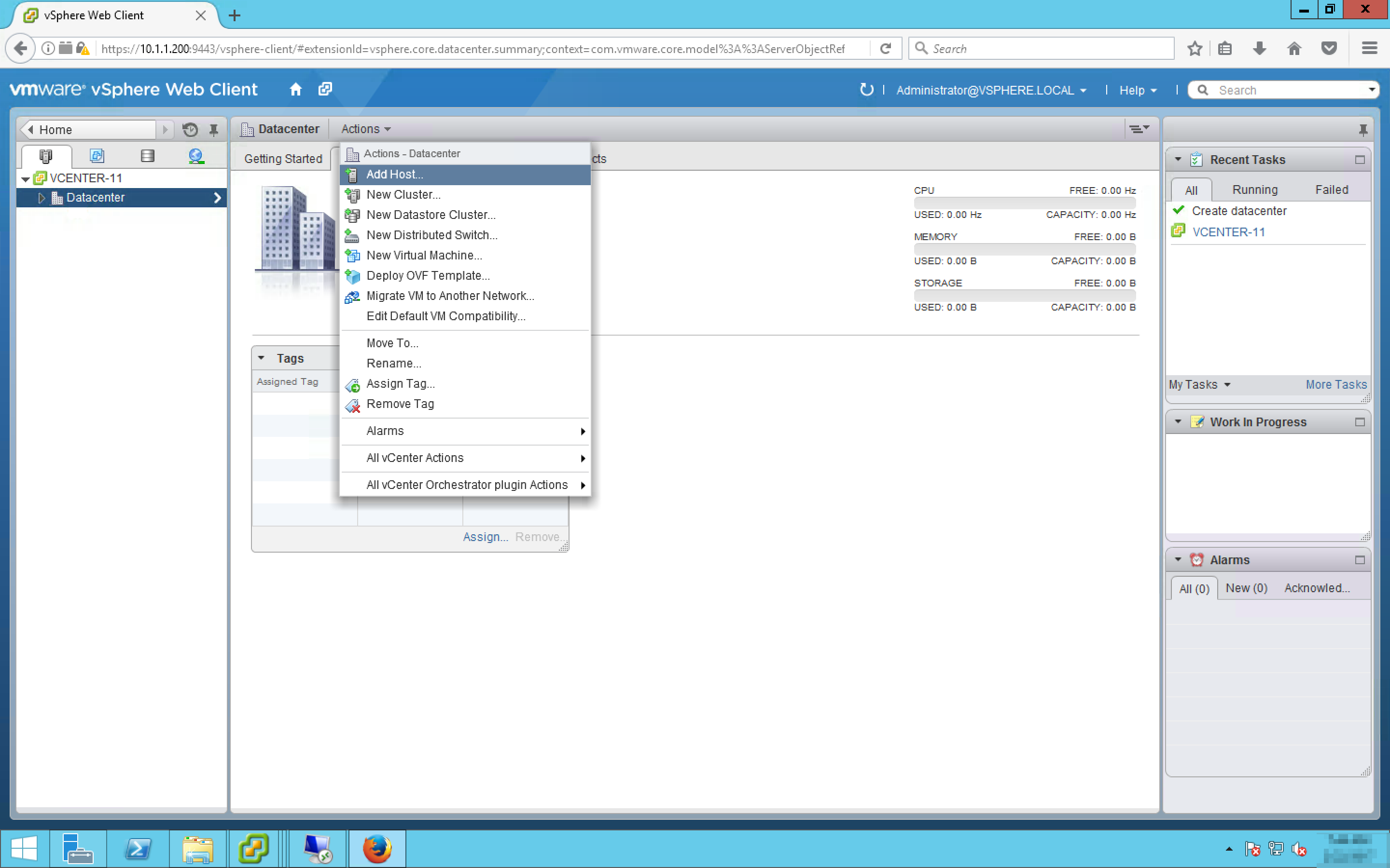 • 左ペインにある前項で作成したデータセンターをクリックし、画面上部の [Action] > [Add Host...] をクリックします。