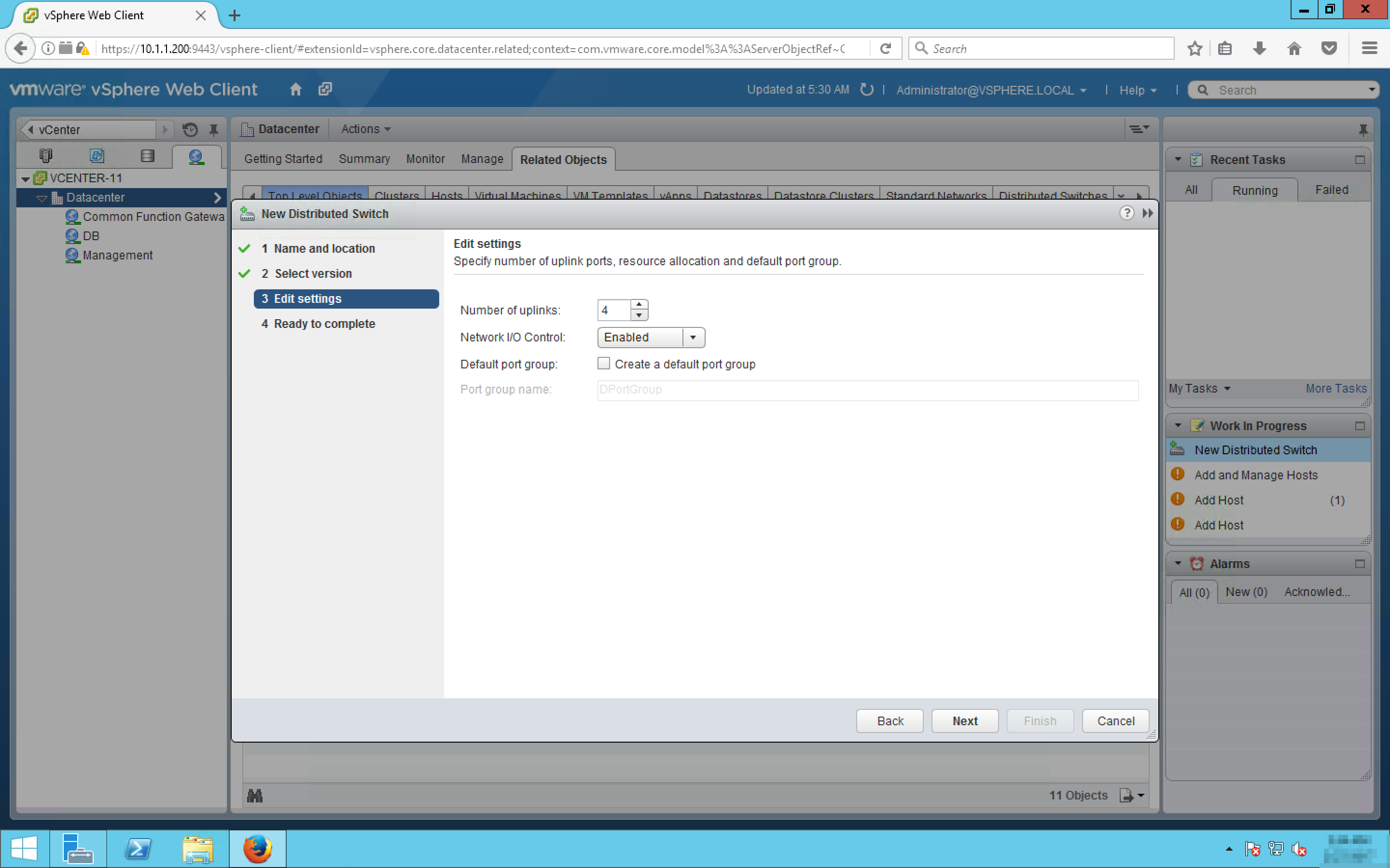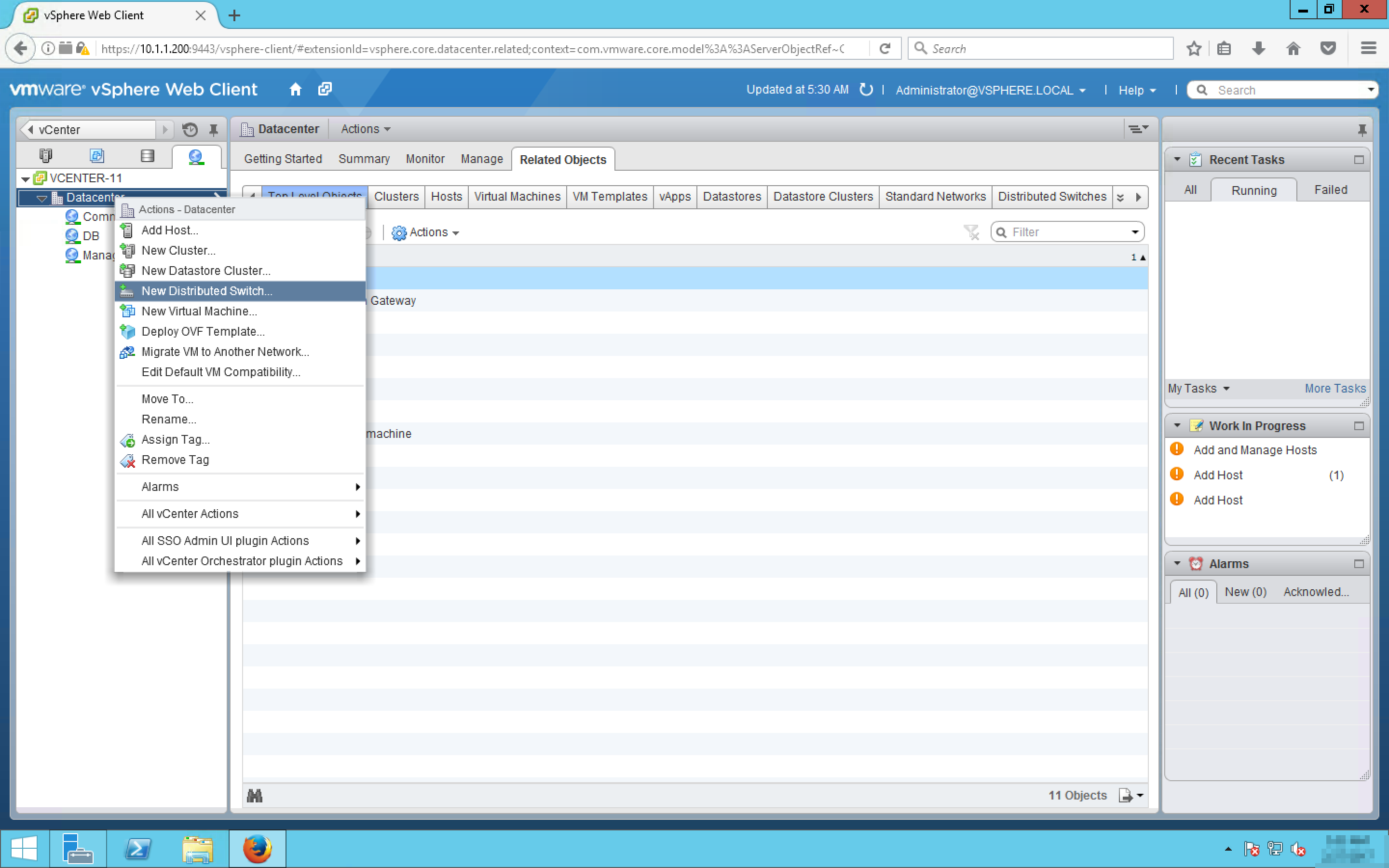 vSphere Web Client へログインし、左インベントリより、vCenterをクリックします。 インベントリより、[vCenter] > [Inventory Trees]配下の[Networking]をクリックします。 インベントリの[Datacenter]を右クリックし、[New Distributed Switch]をクリックします。