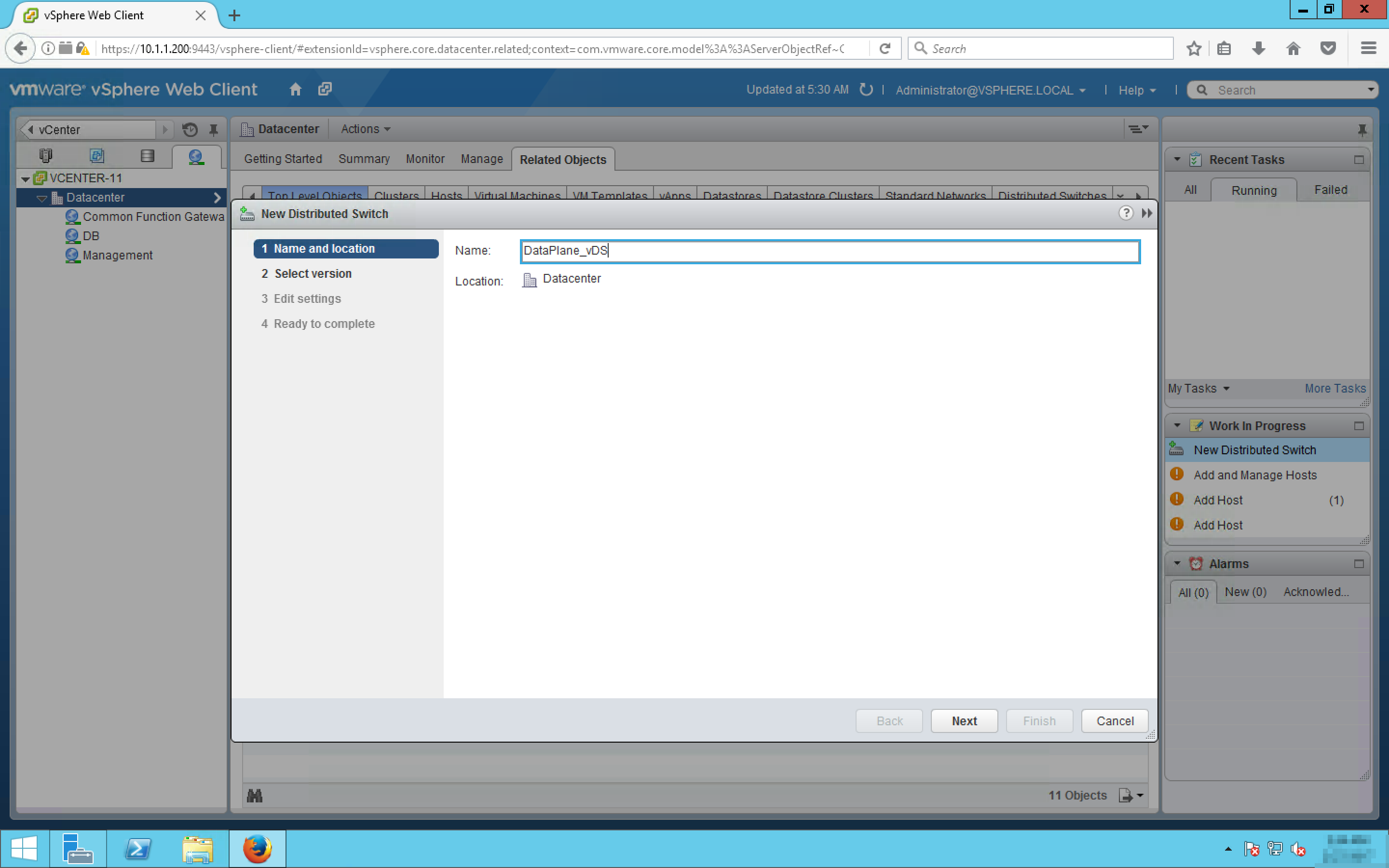 [New Distributed Switch]ウインドウが表示されるので[1 Name and location]にて、必要事項を入力し、[Next]をクリックします。