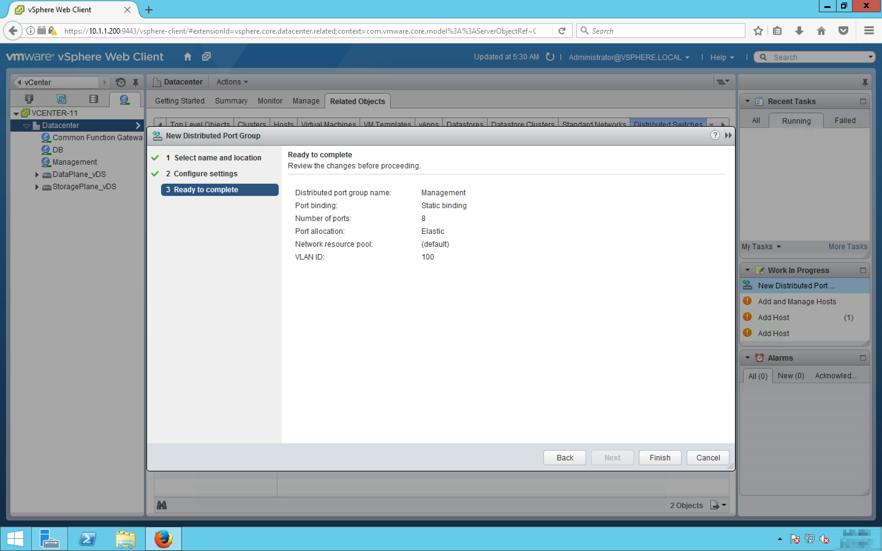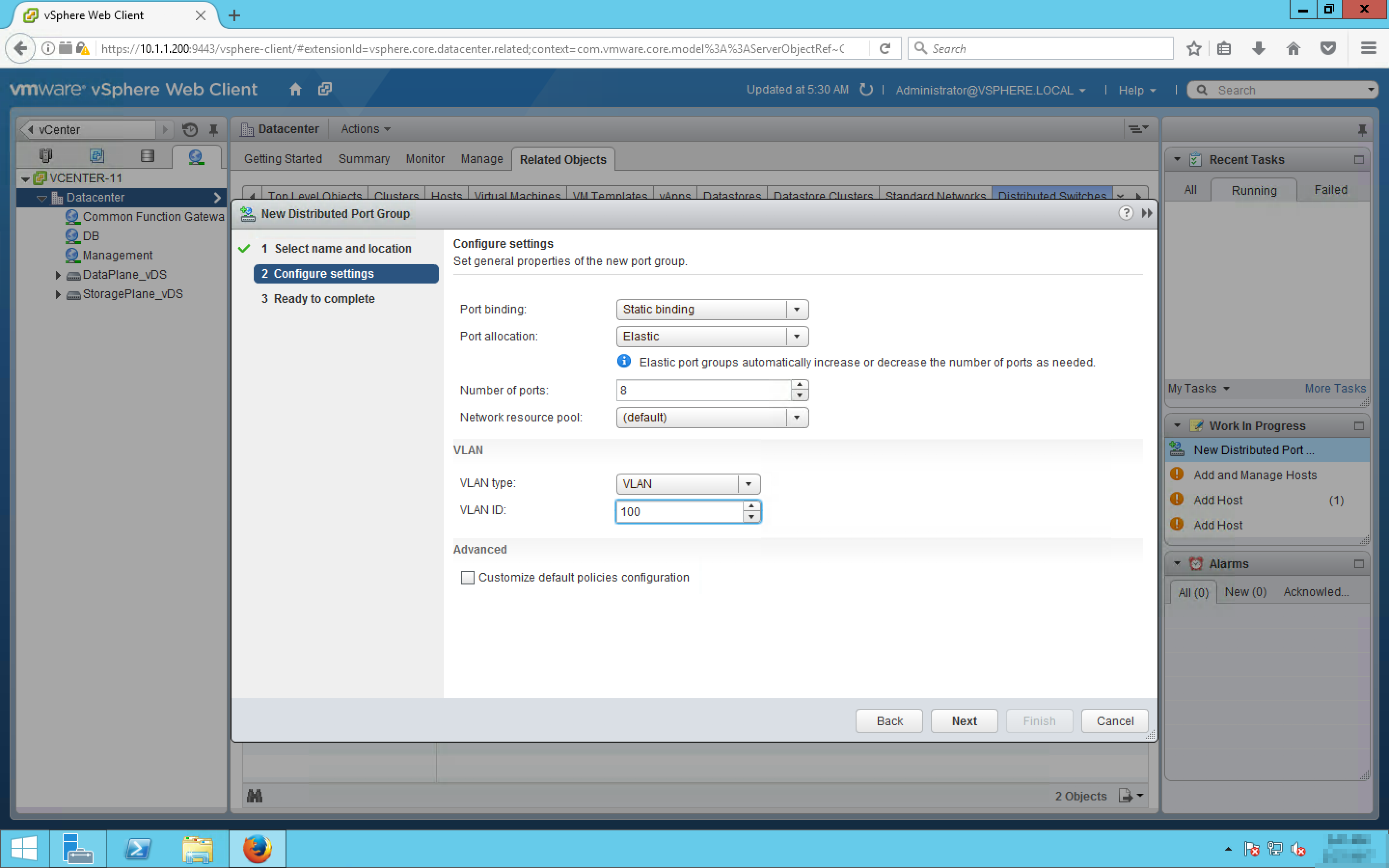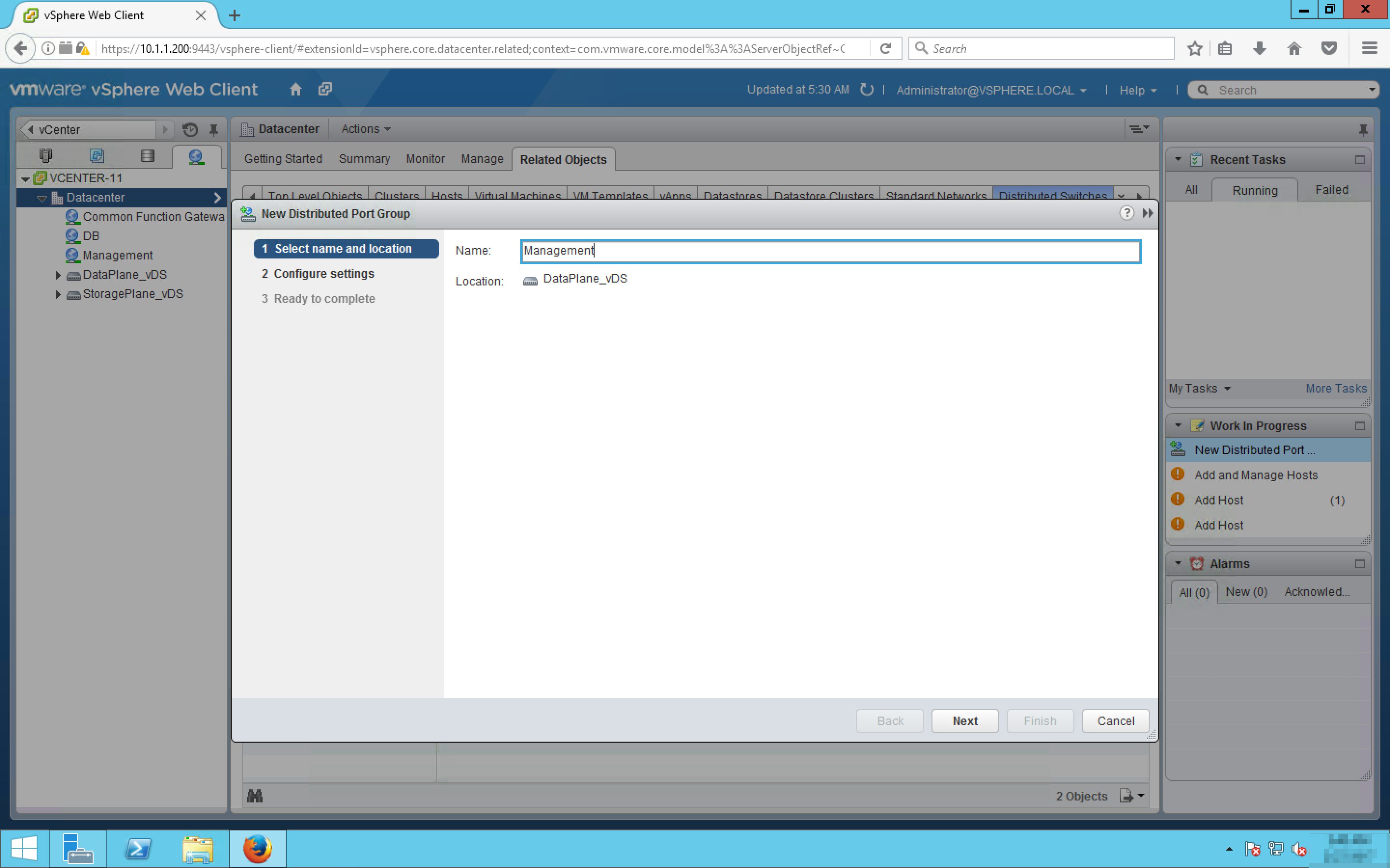 vSphere Web Client のインベントリより、[vCenter] > [Inventory Trees]配下の[Networking]をクリックします。 作成したvDSを右クリックし、[New Distributed Port Group]をクリックします。