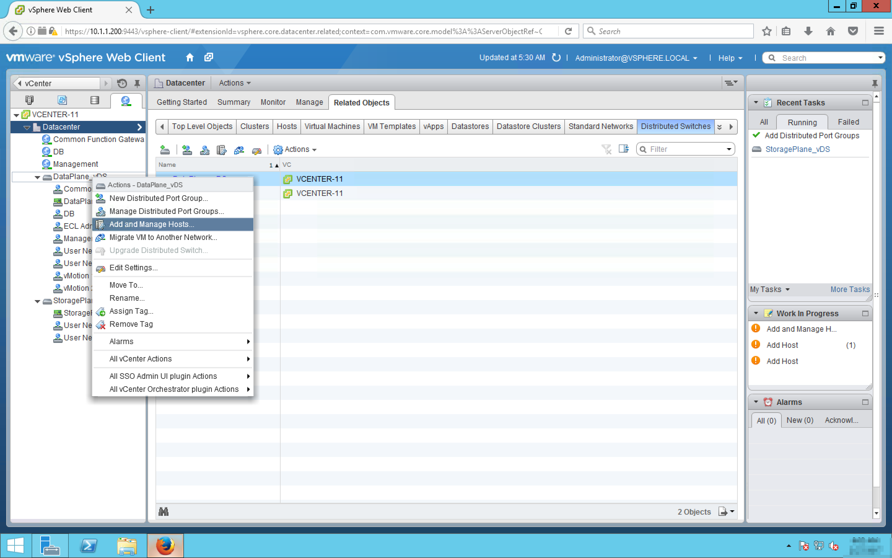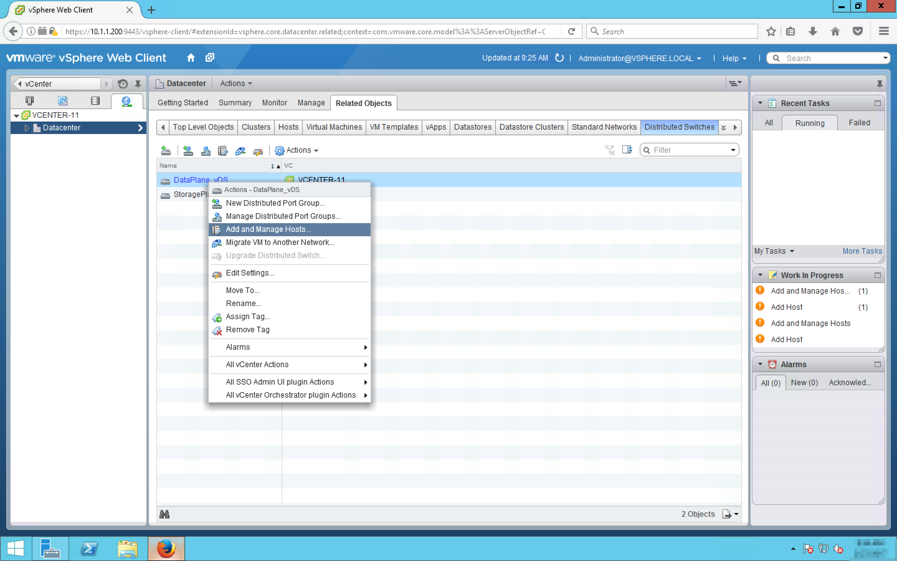 作成したvDSを右クリックし、[Add and Manage Hosts]をクリックします。