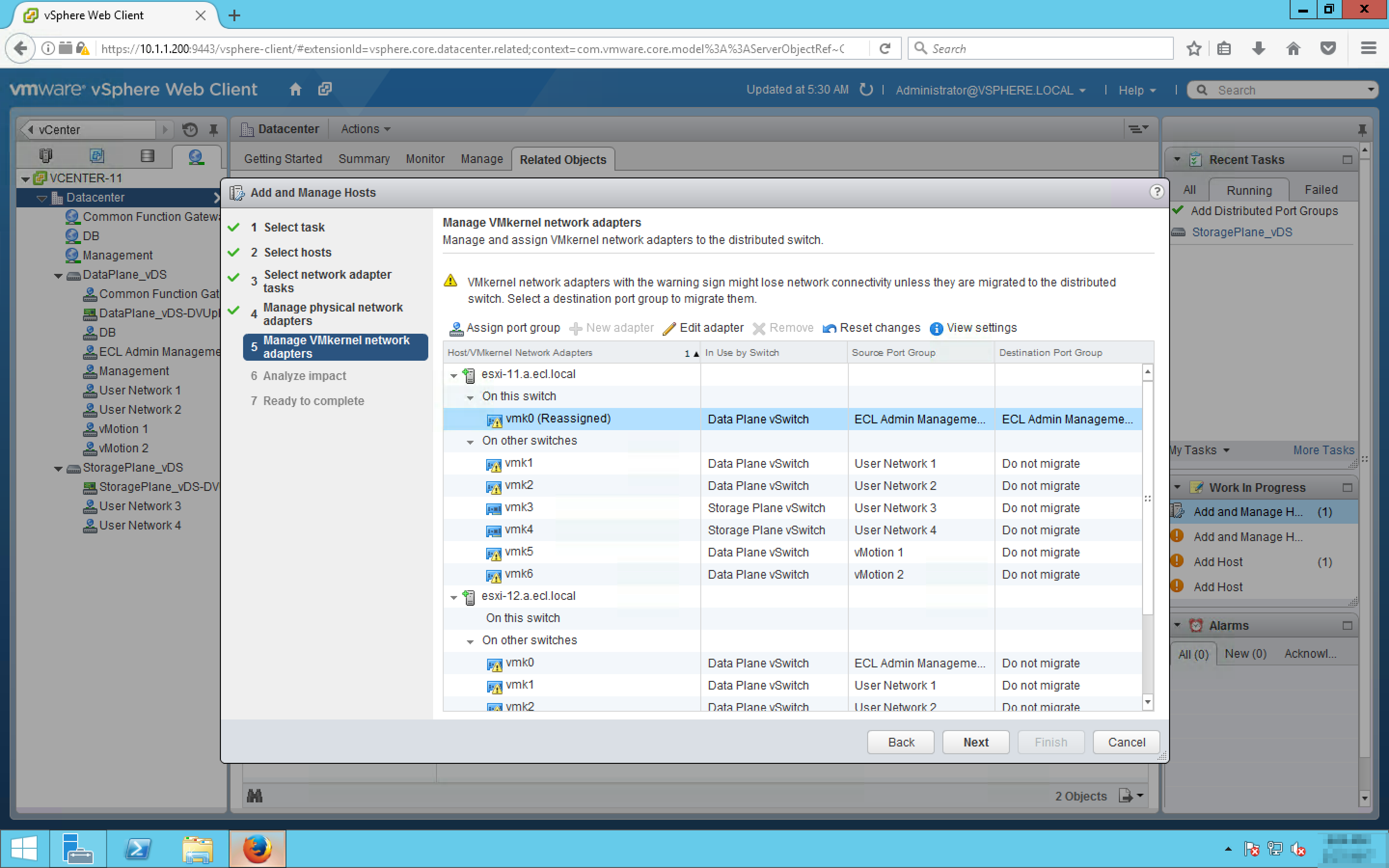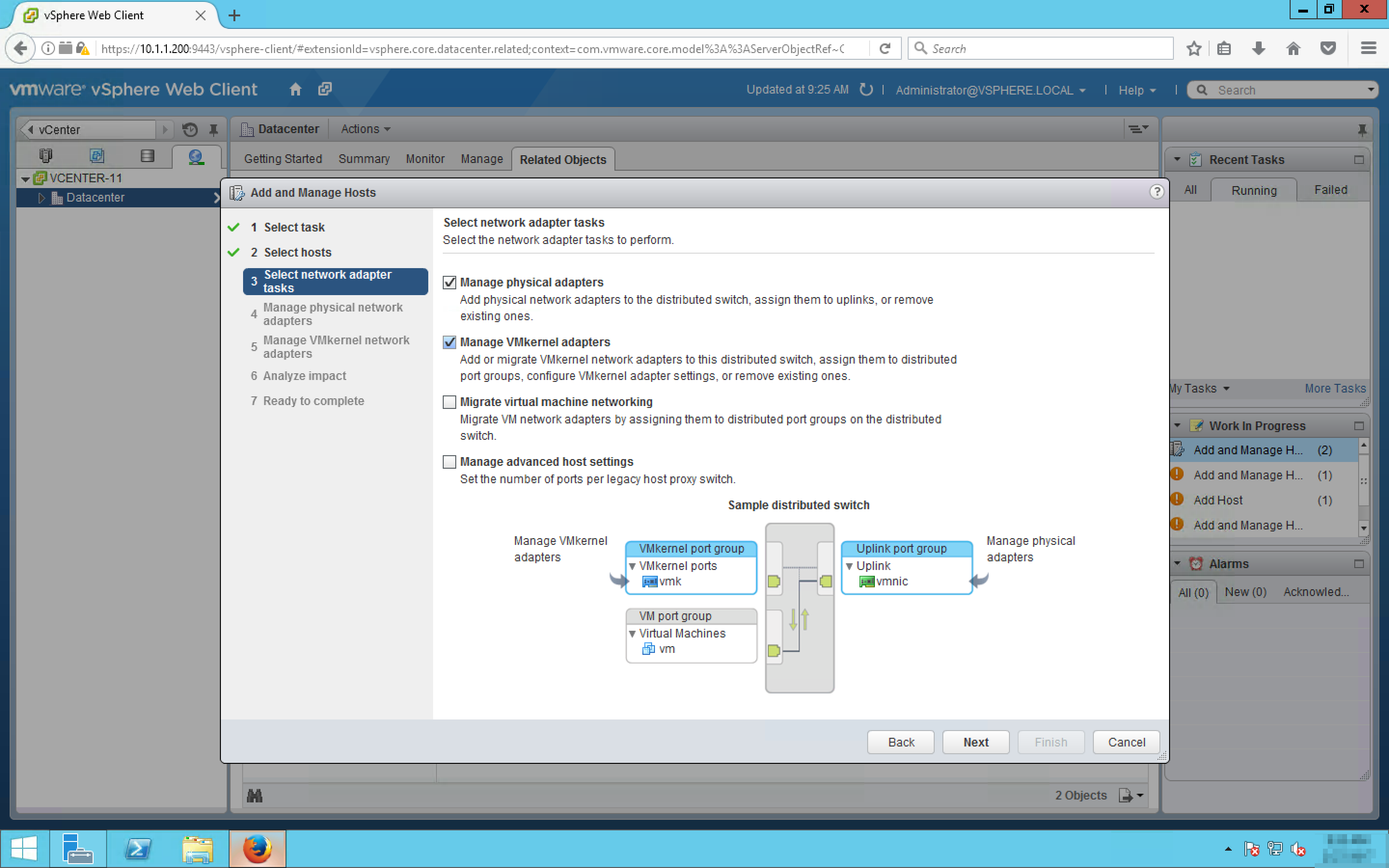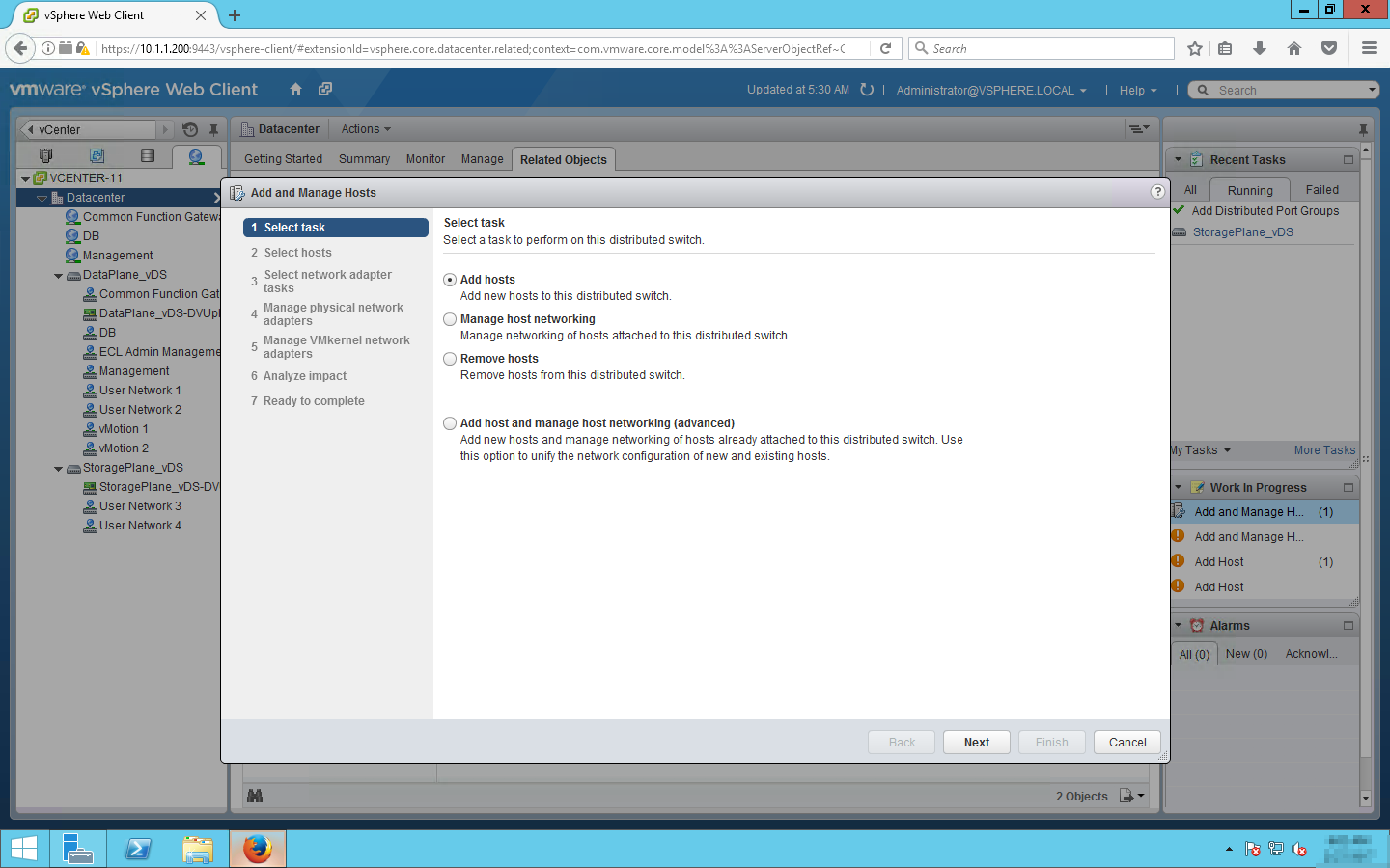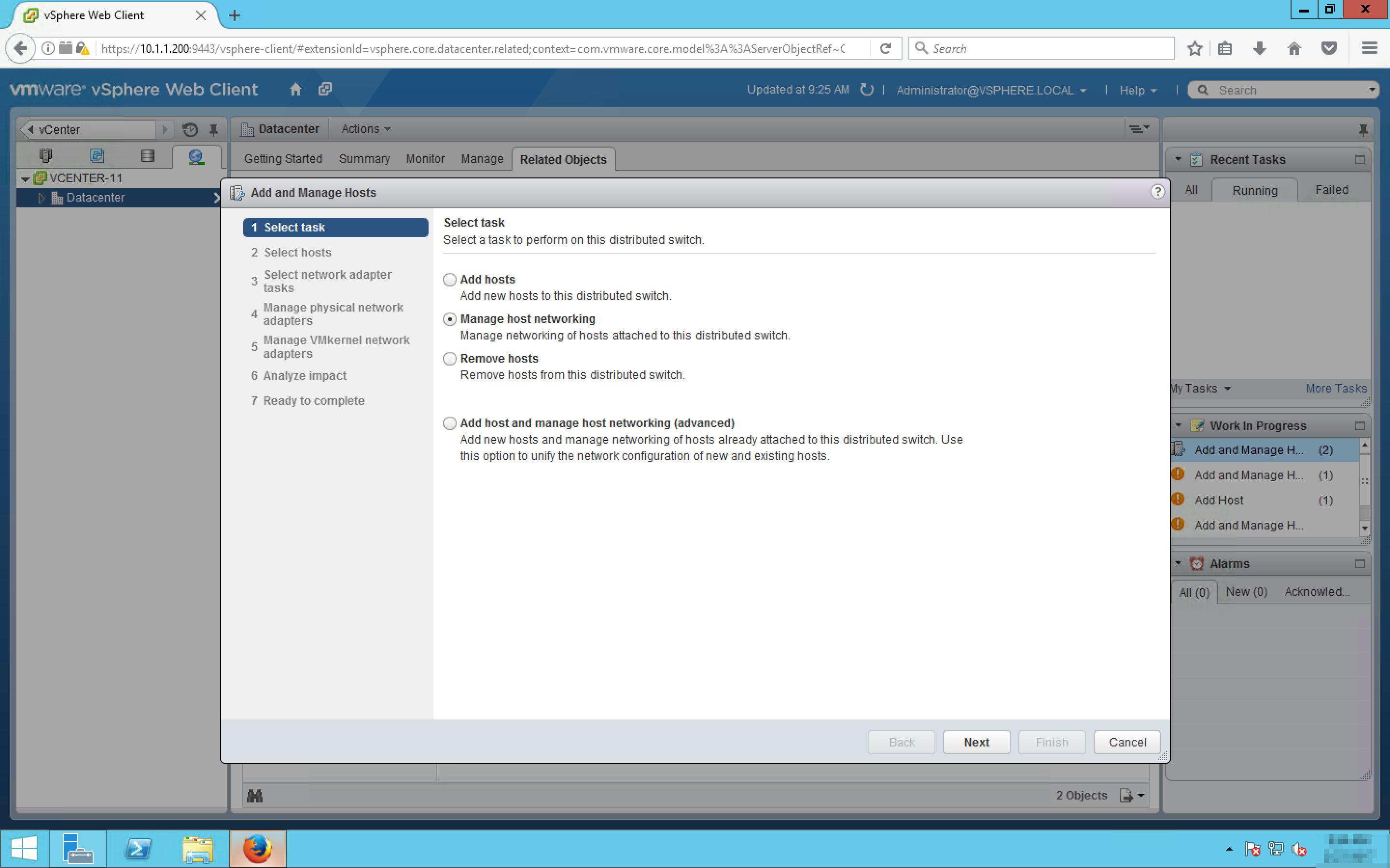 [Add and Manage Hosts]ウインドウが表示されるので、[1 Select task]にて[Manage host networking]を選択し、[Next]をクリックします。