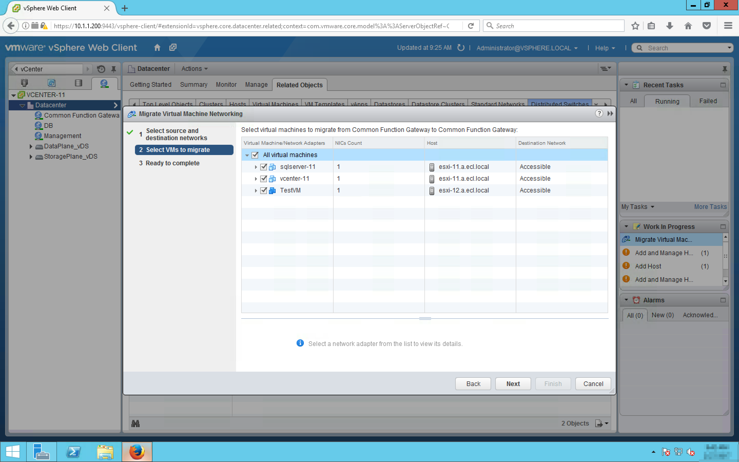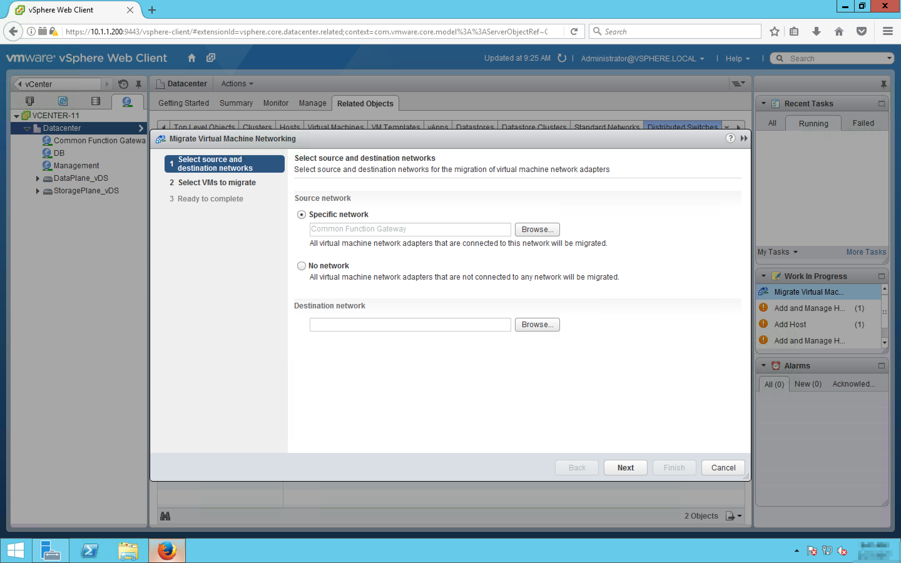 [Migrate Virtual Machine Networking]ウインドウが表示されるので、[1 Select source and destination networks]にて必要事項を入力し、[Next]をクリックします。