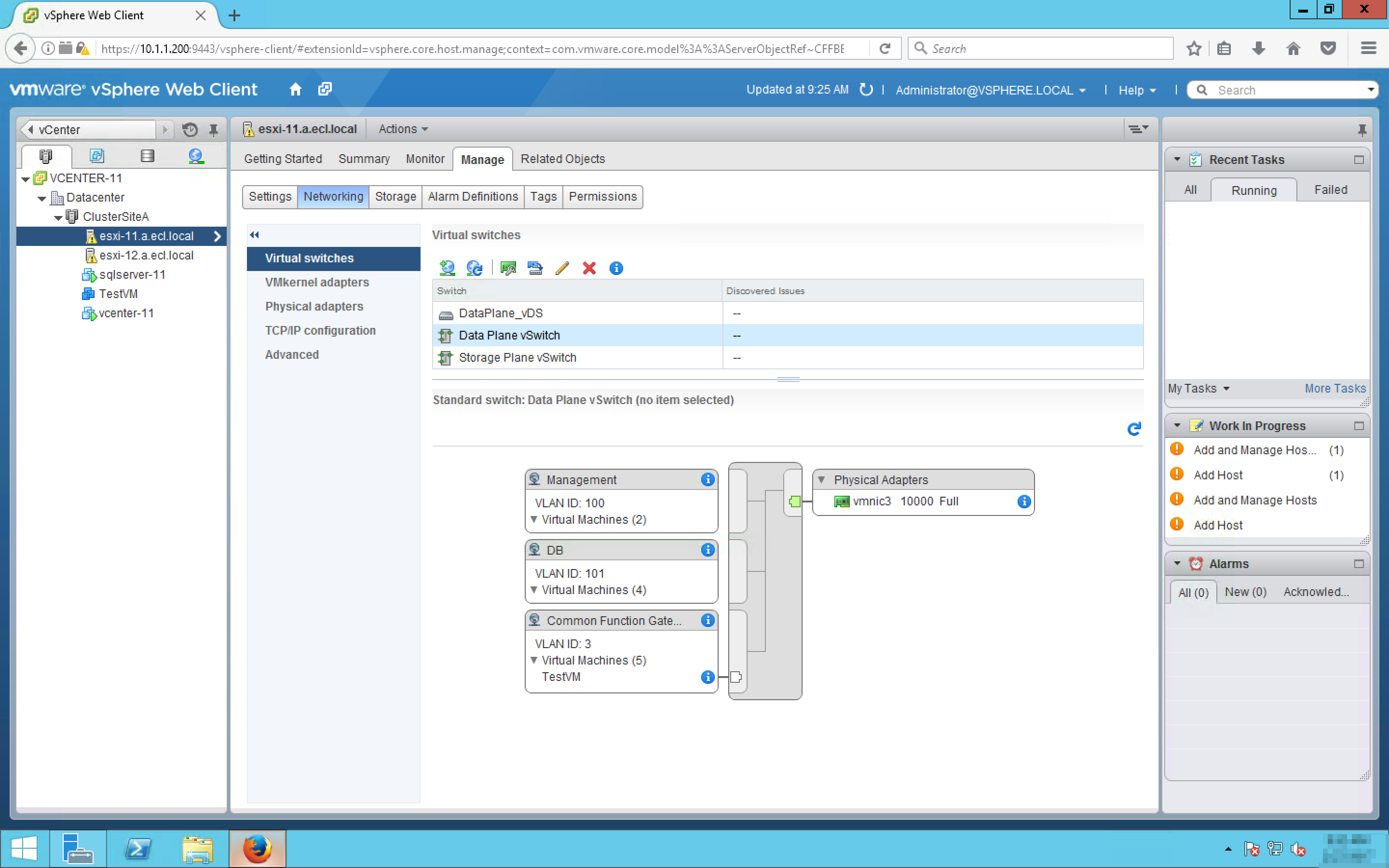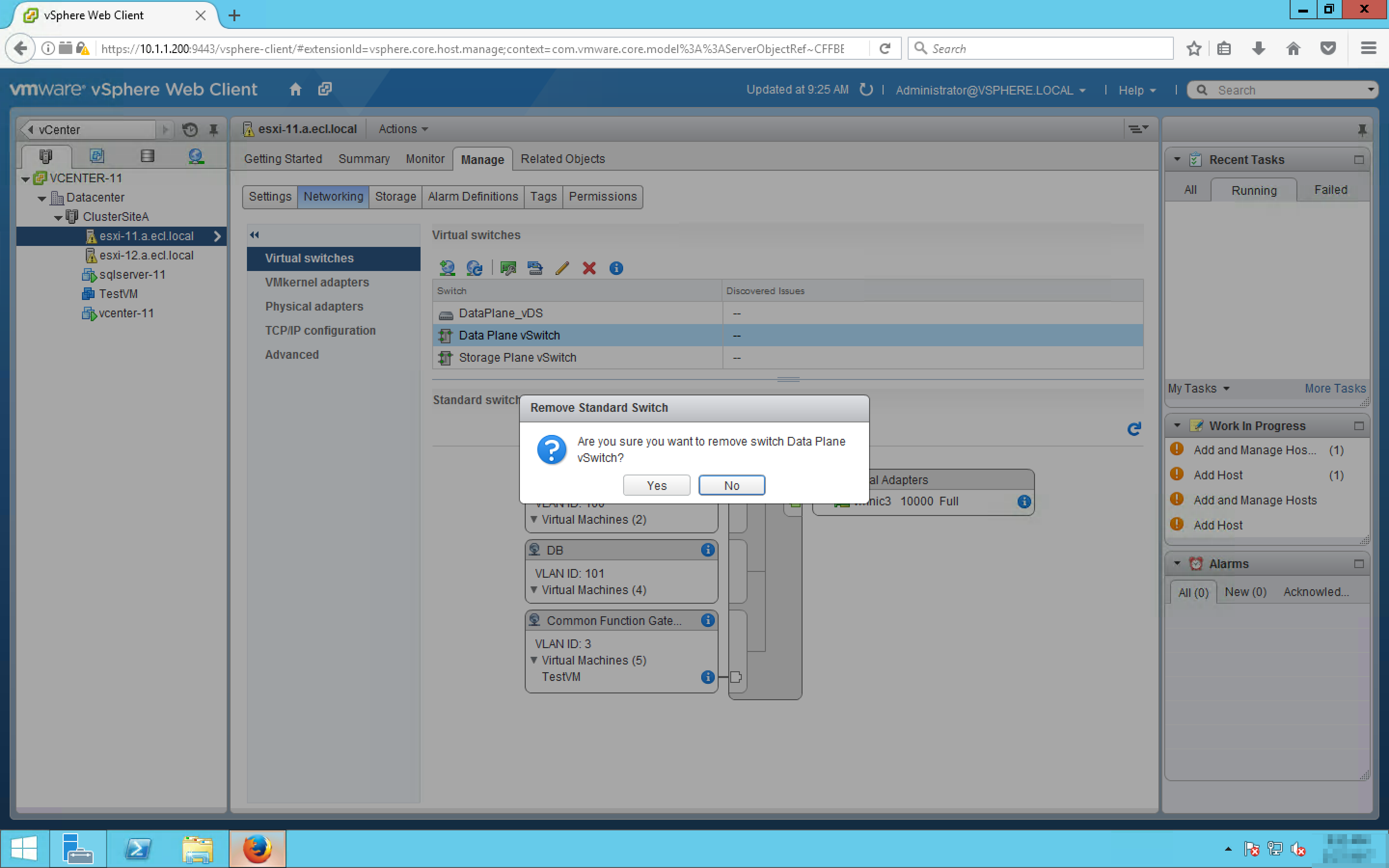 vSphere Web Client のインベントリより、[vCenter] > [Inventory Trees]配下の[Hosts and Clusters]をクリックします。 [Datacenter]配下の[esxi-11.a.ecl.local]を選択し、中央ペインより[Manage]タブをクリックします。 [Manage]タブ内の[Networking] > [Virtual switches]をクリックします。 削除対象の仮想マシンスイッチを選択し、[Remove selected standard switch]をクリックします。