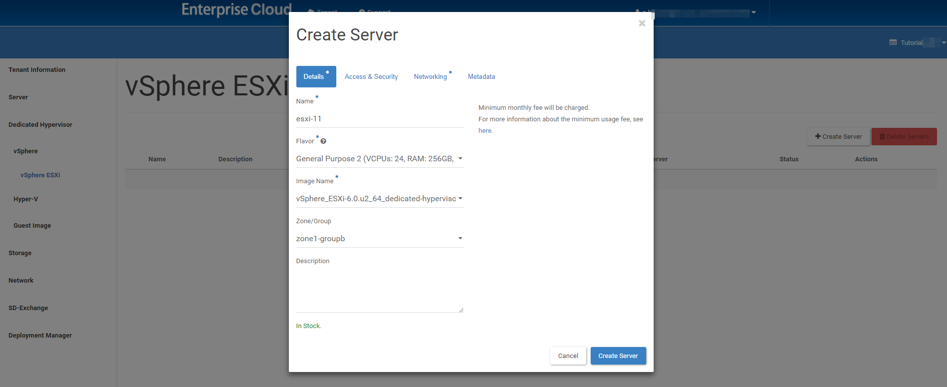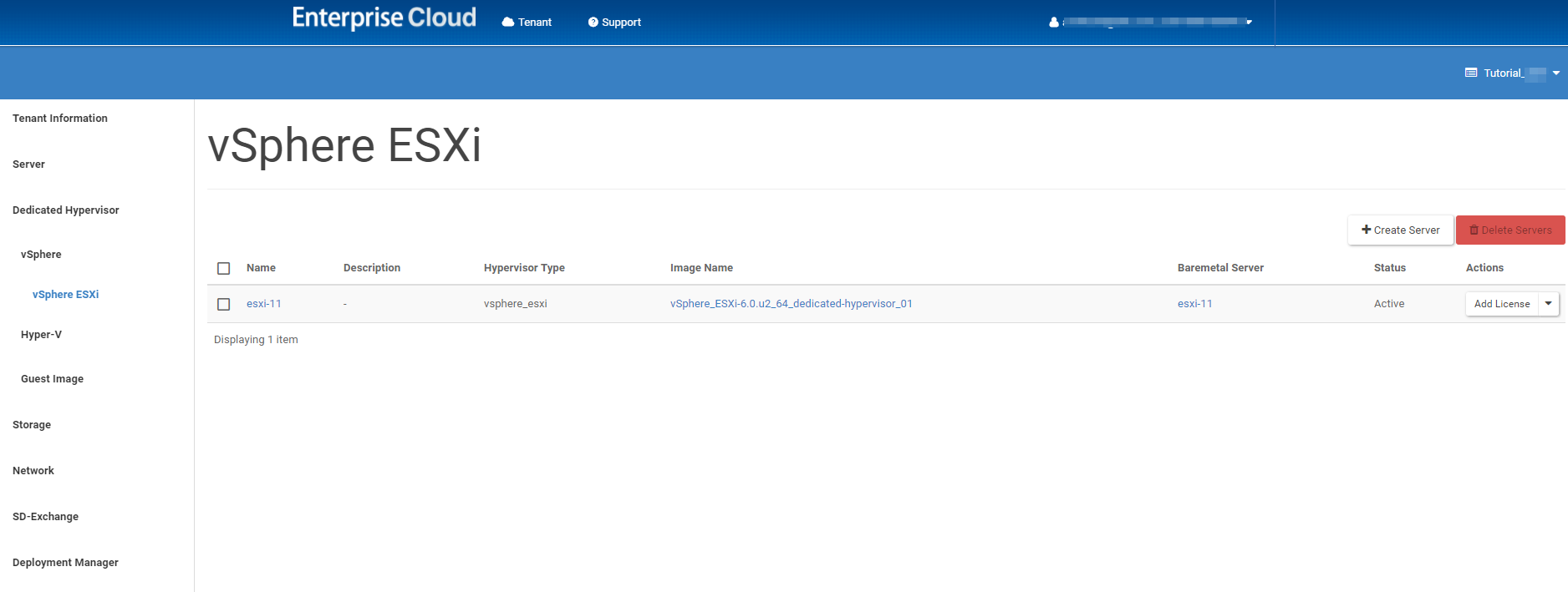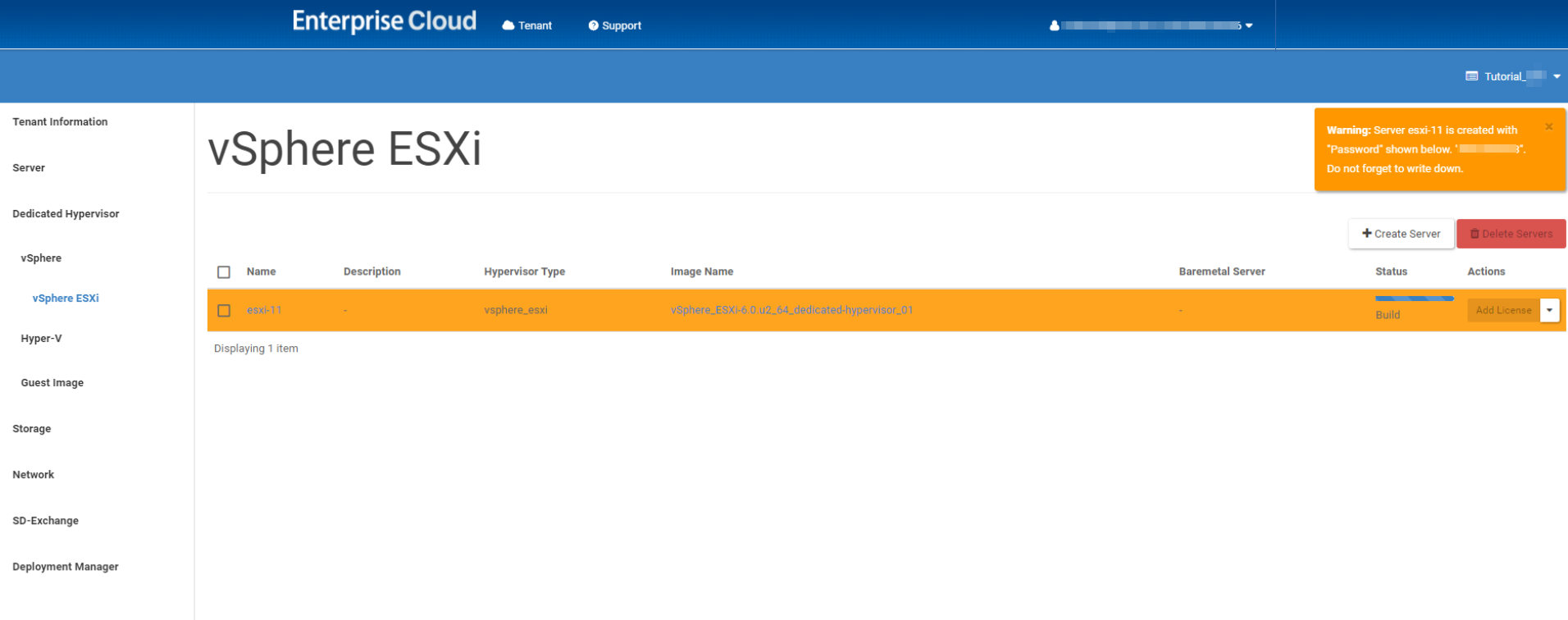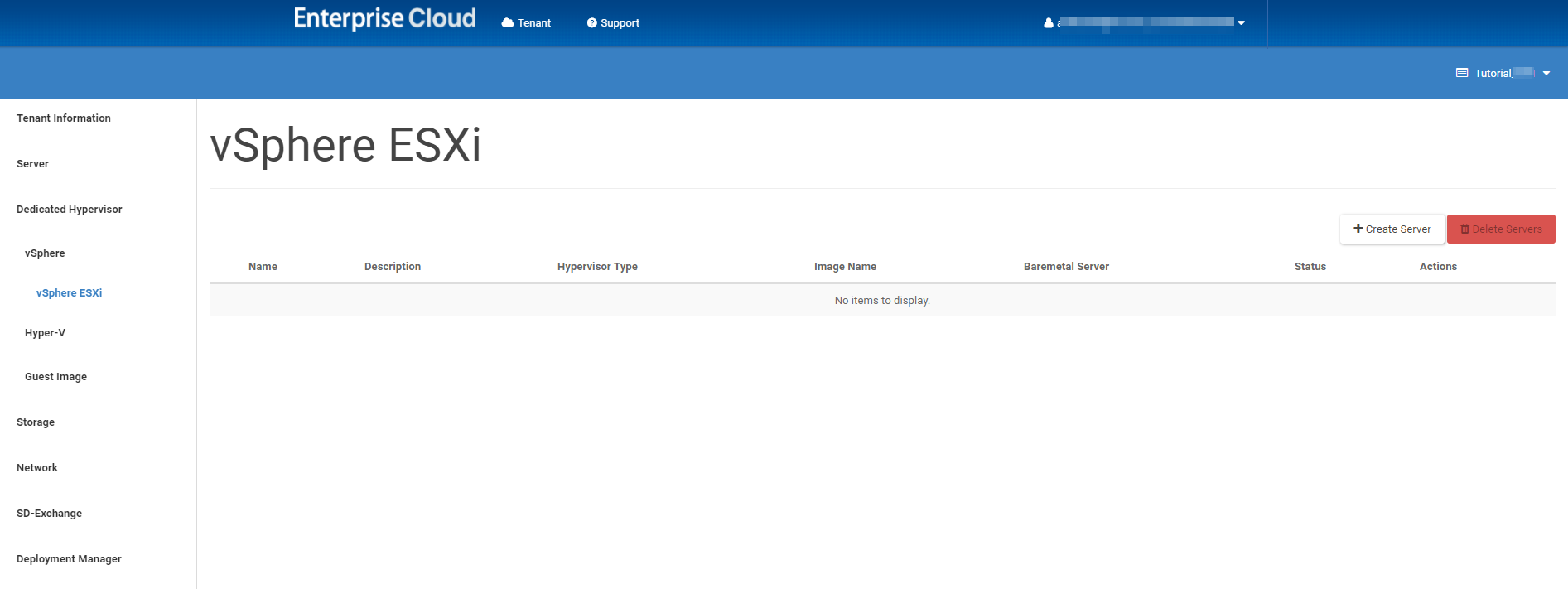 - [Tenant Information]画面にて、[Dedicated Hypervisor] > [vSphere] > [vSphere ESXi]をクリックします。[vSphere ESXi]画面右上の [+Create Server] をクリックします。