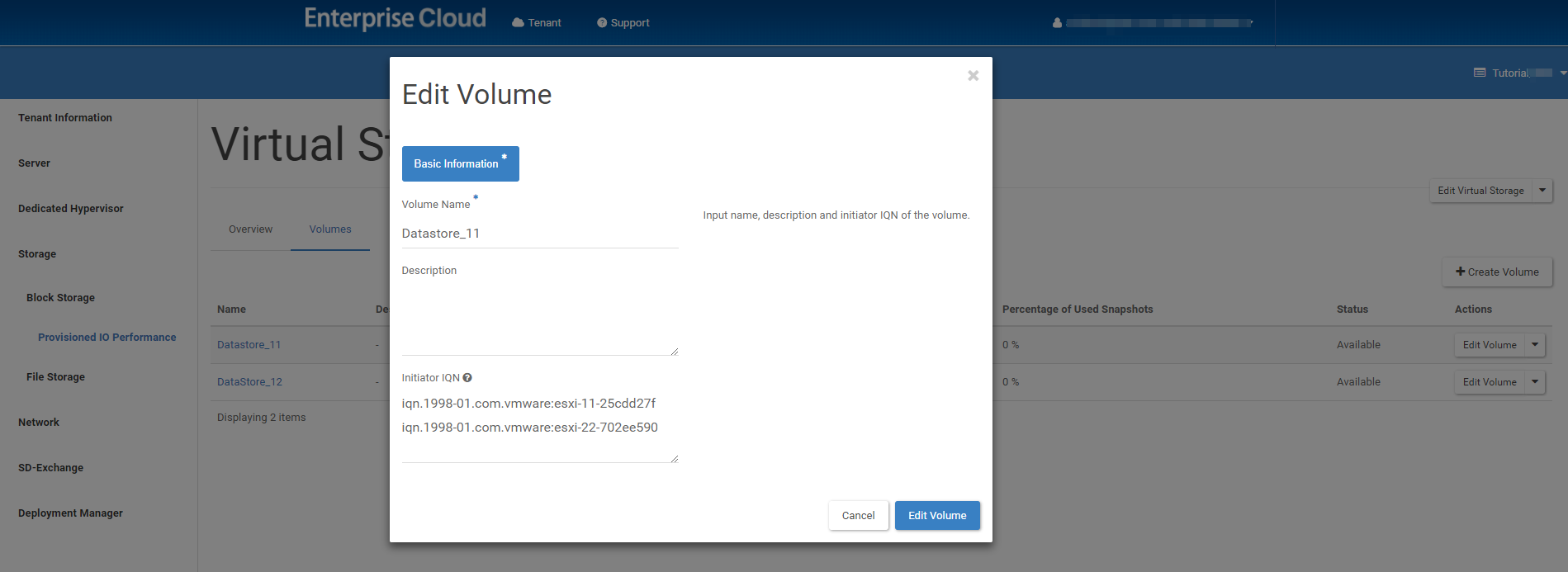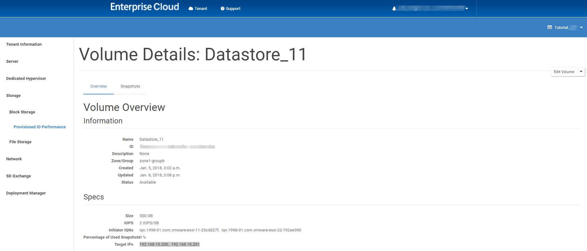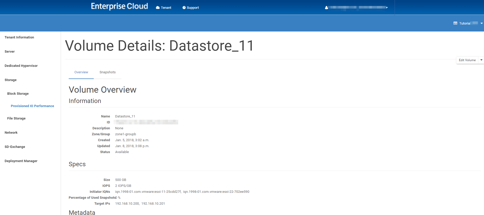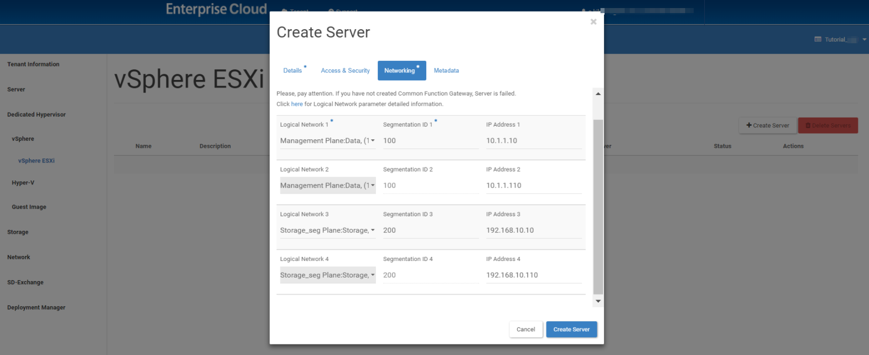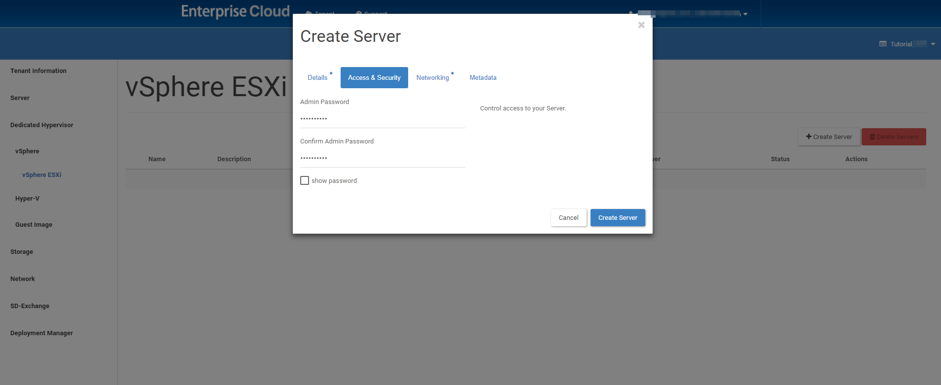 - [Tenant Information]画面にて、[Dedicated Hypervisor] > [vSphere] > [vSphere ESXi]をクリックします。[vSphere ESXi]画面右上の [+Create Server] をクリックします。