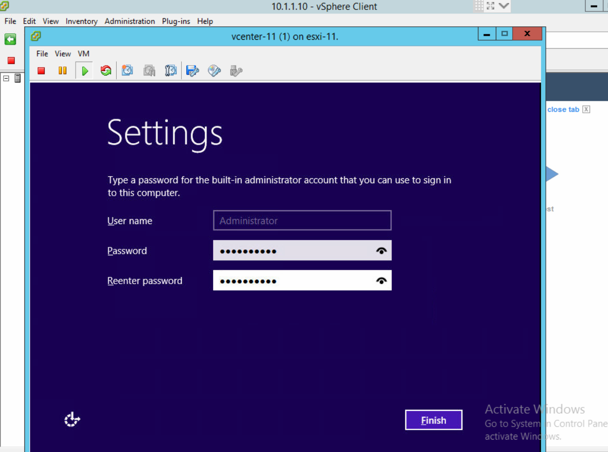 [Settings]が表示後、設定する Administrator のパスワードを入力および確認入力し、[Finish]をクリックします。