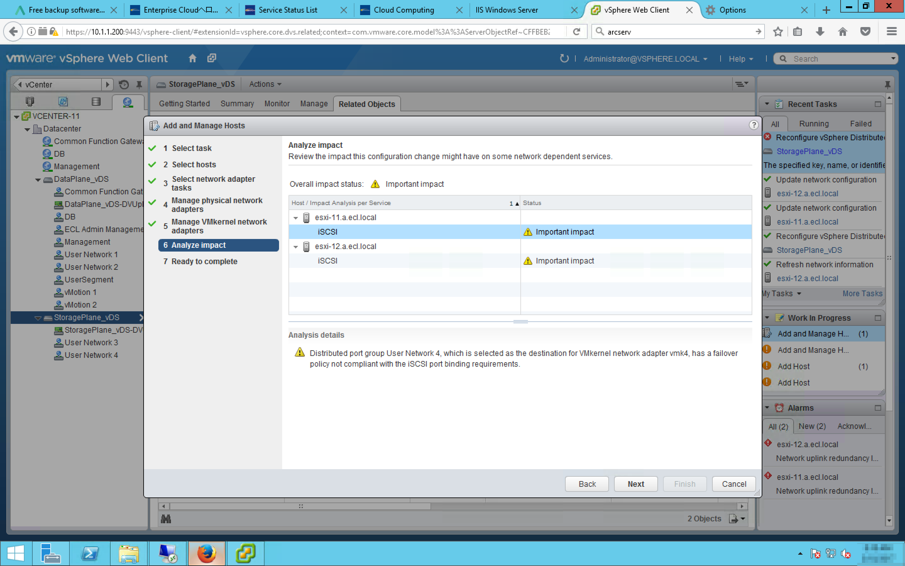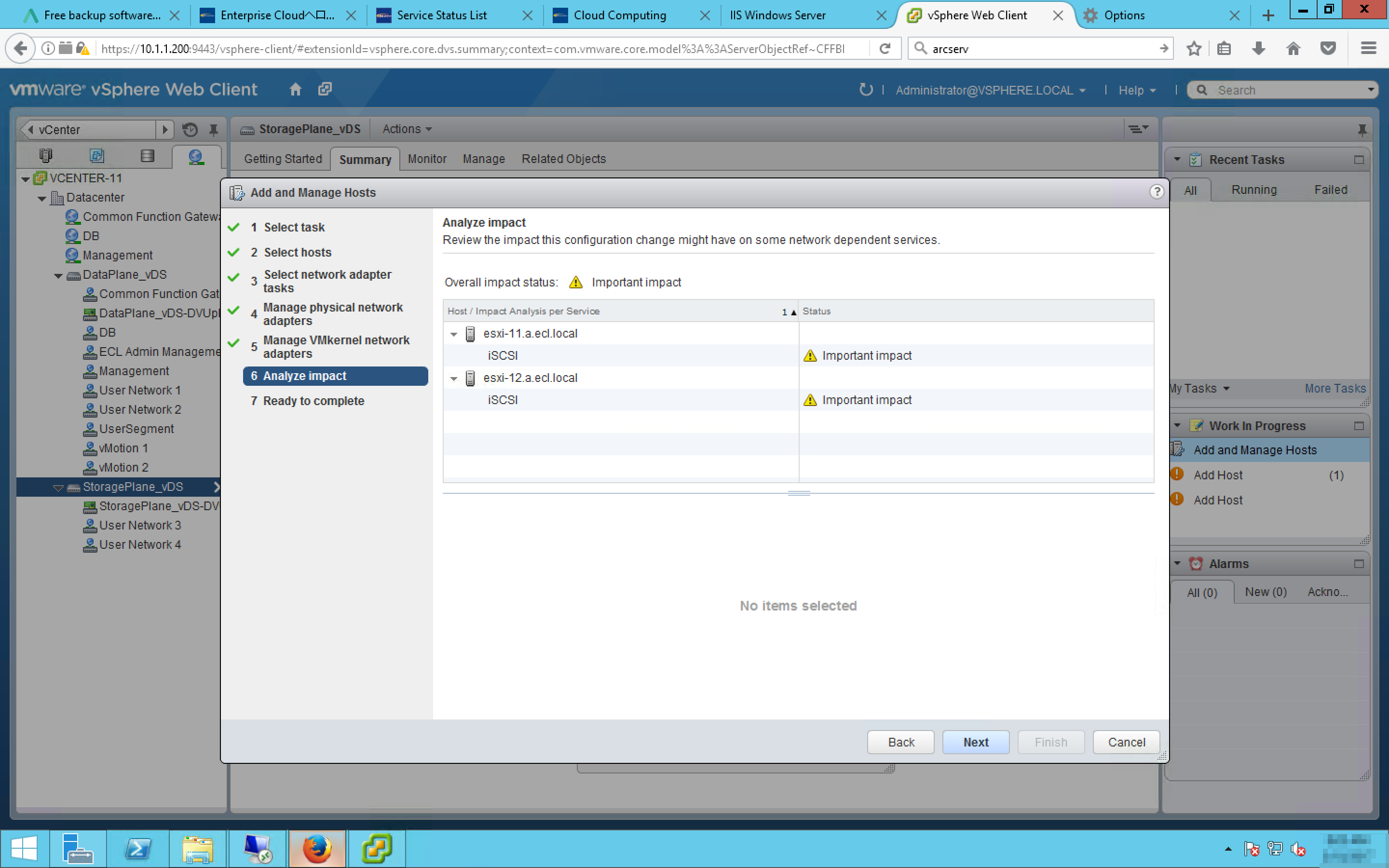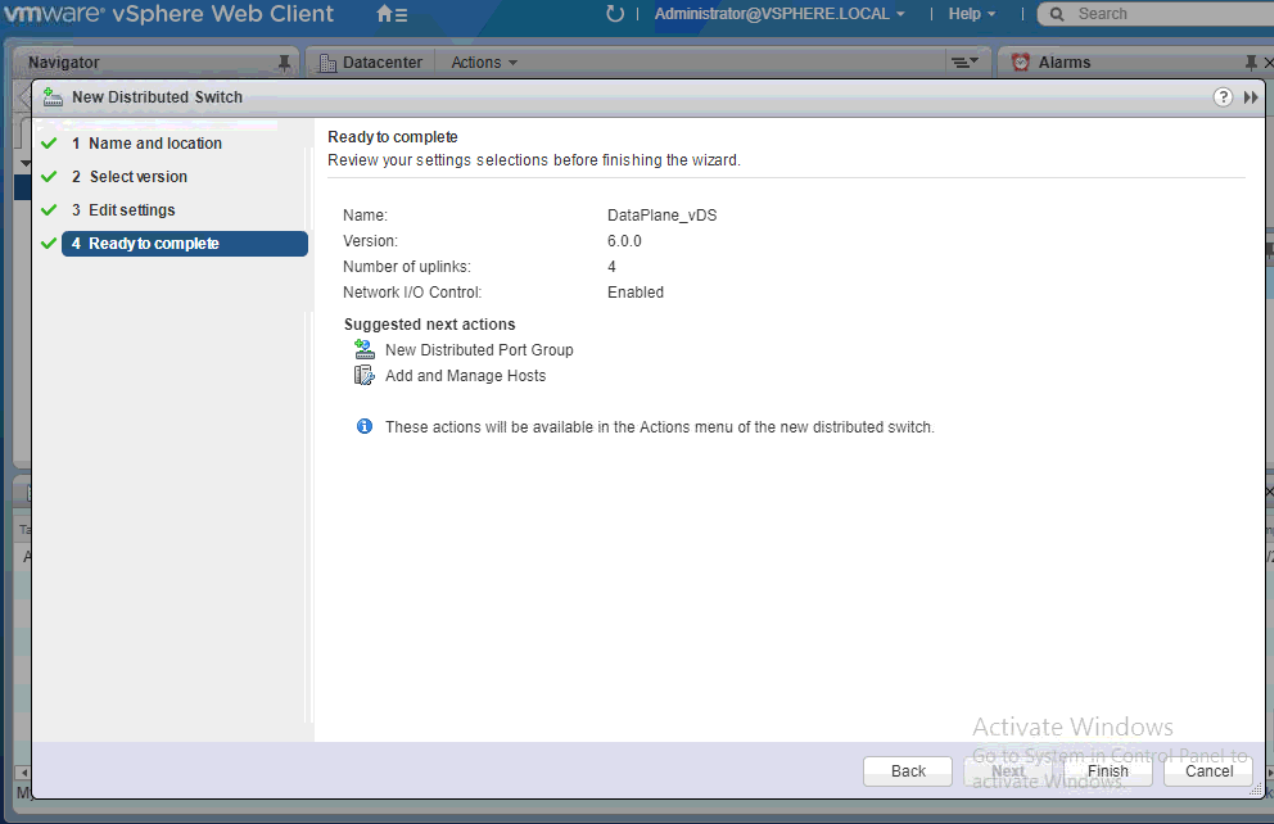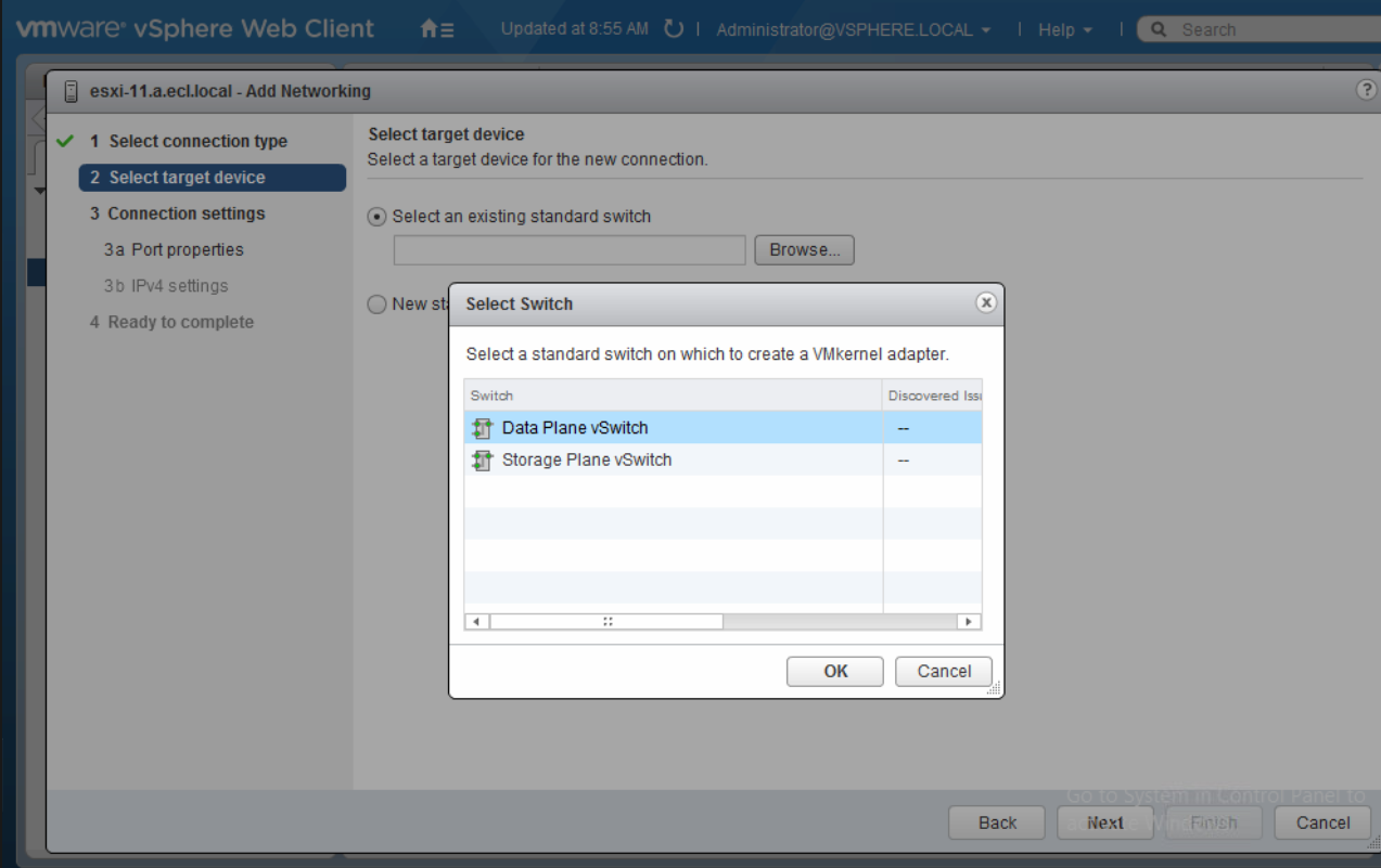 [Selection target device]にて[Select an existing standard switch]を選択[Browser...]を押し、[Data Plain switch]を選択し[Next]をクリックします
