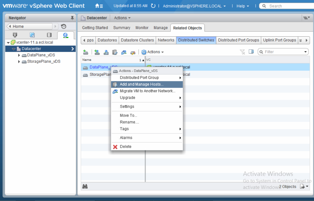 作成したvDSを右クリックし、[Add and Manage Hosts]をクリックします。