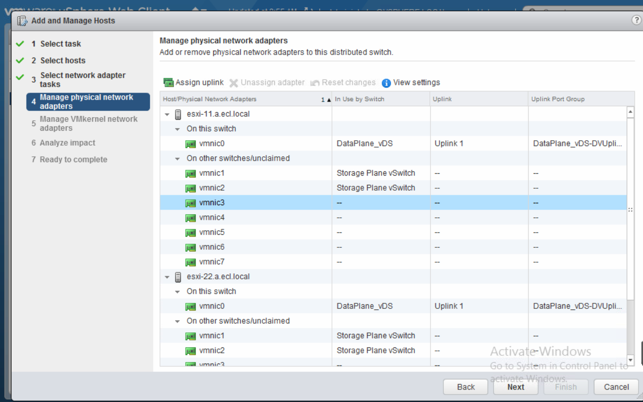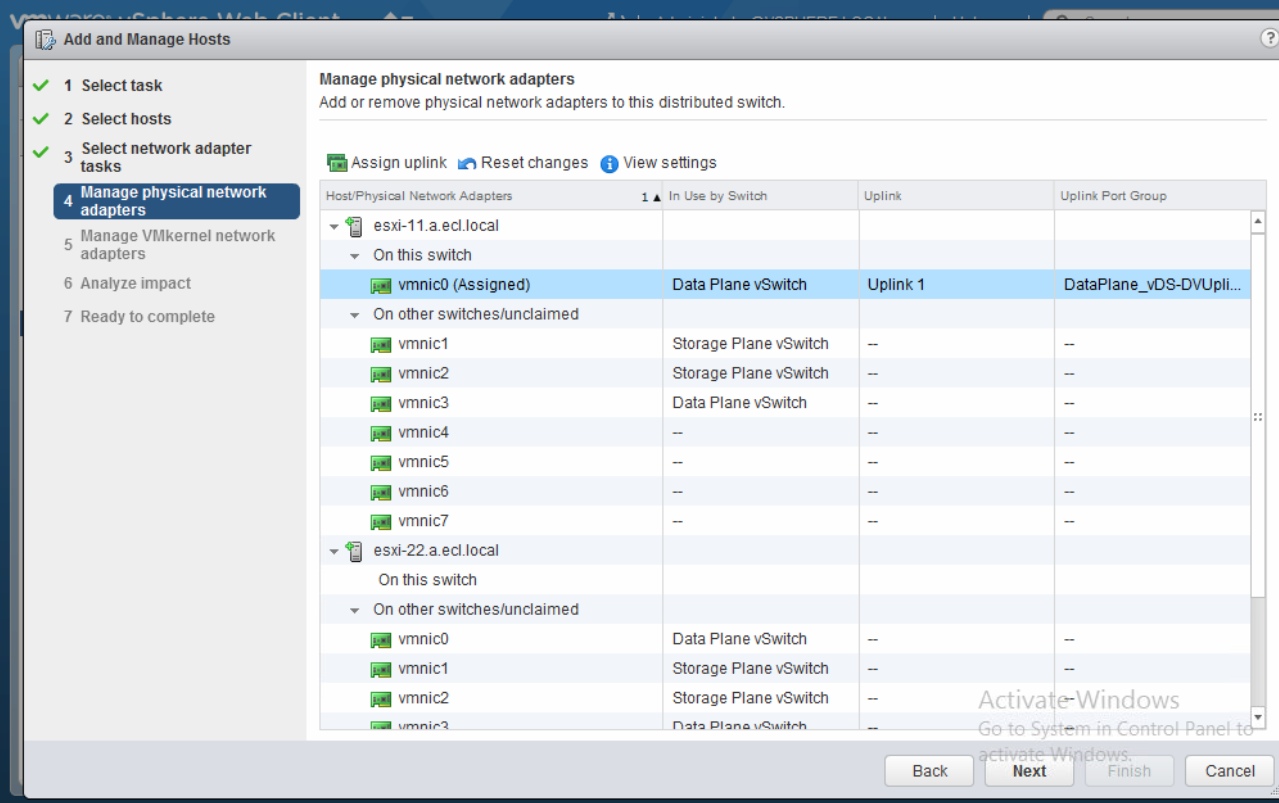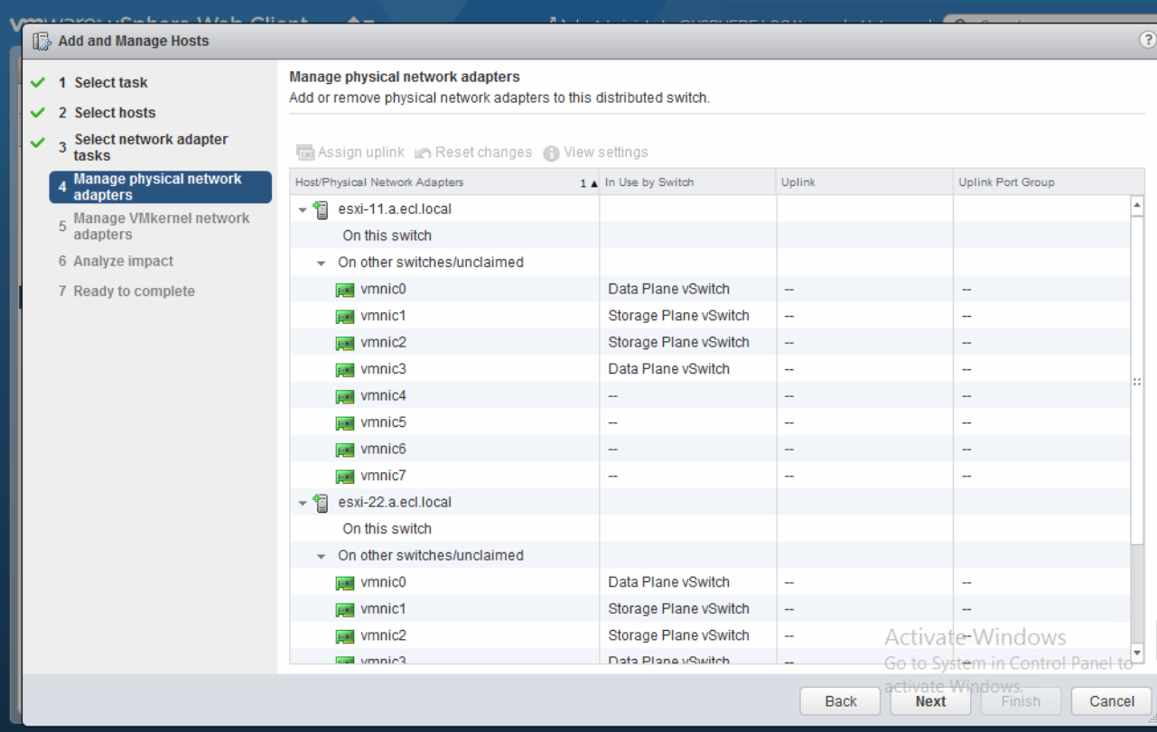 同様にすべてのESXiホストに[uplink]を追加し、[Next]をクリックします。