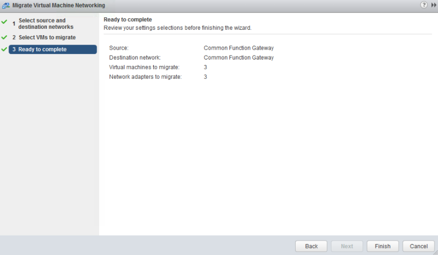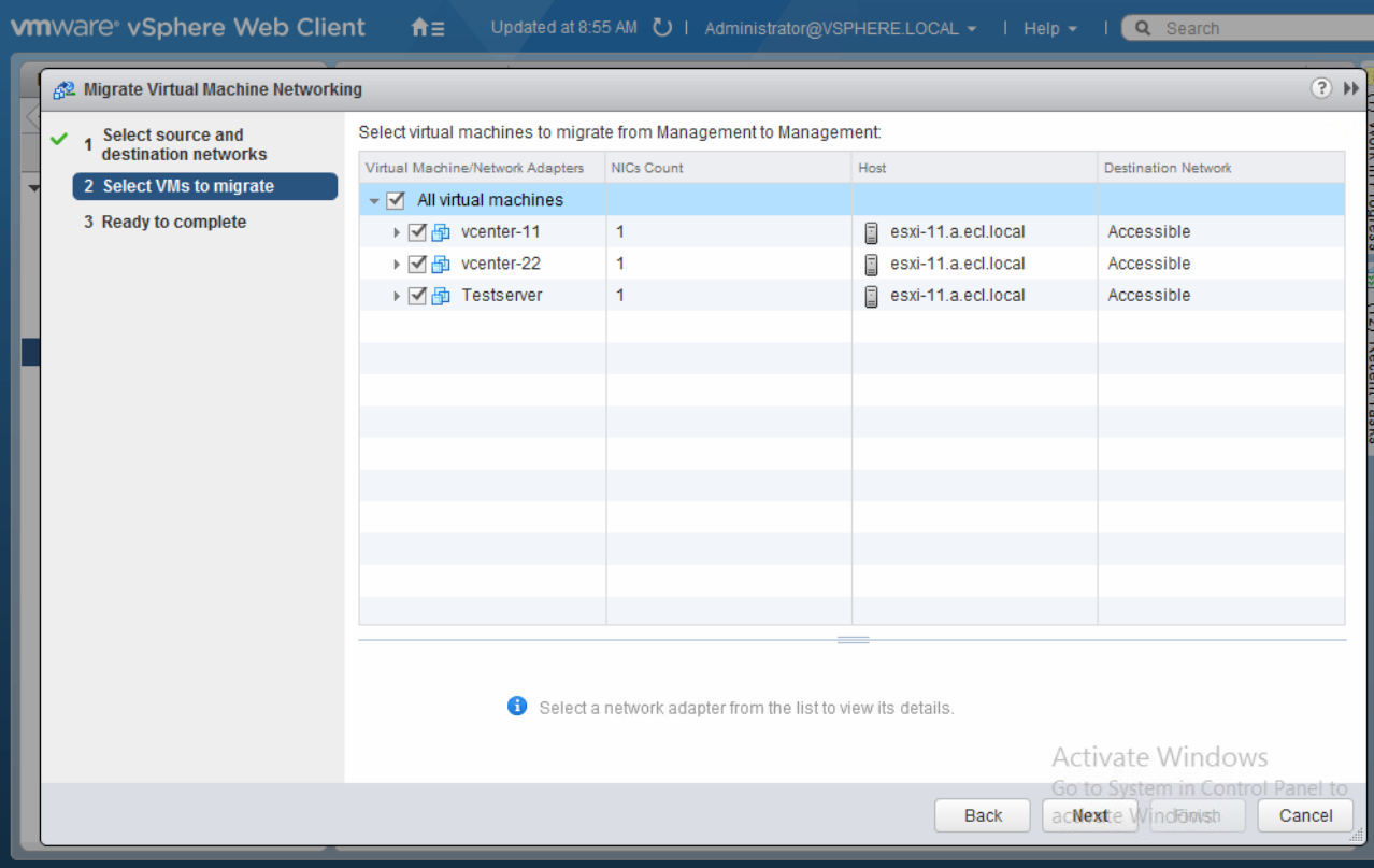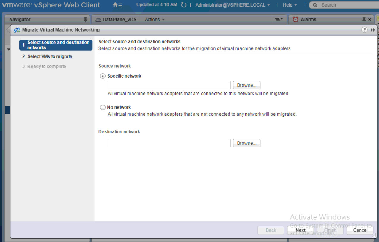 [Migrate Virtual Machine Networking]ウインドウが表示されるので、[1 Select source and destination networks]にて必要事項を入力し、[Next]をクリックします。
