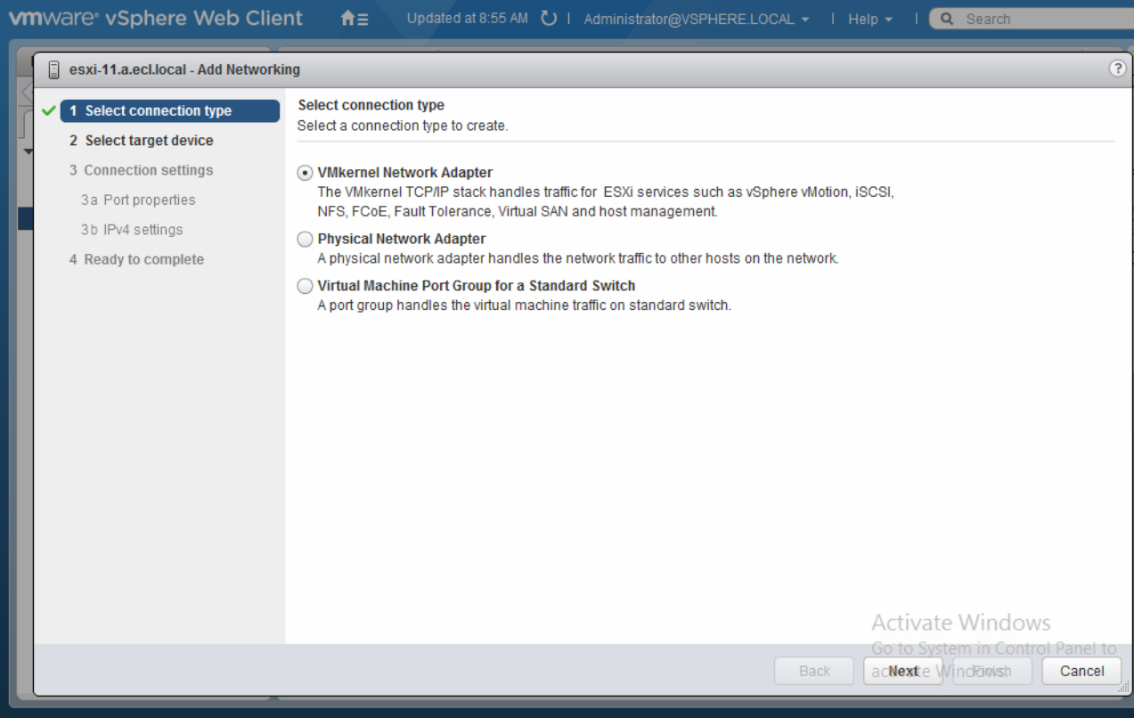 [Selection connection type]にて[VMkernel Network adapter]を選択し[Next]をクリックします