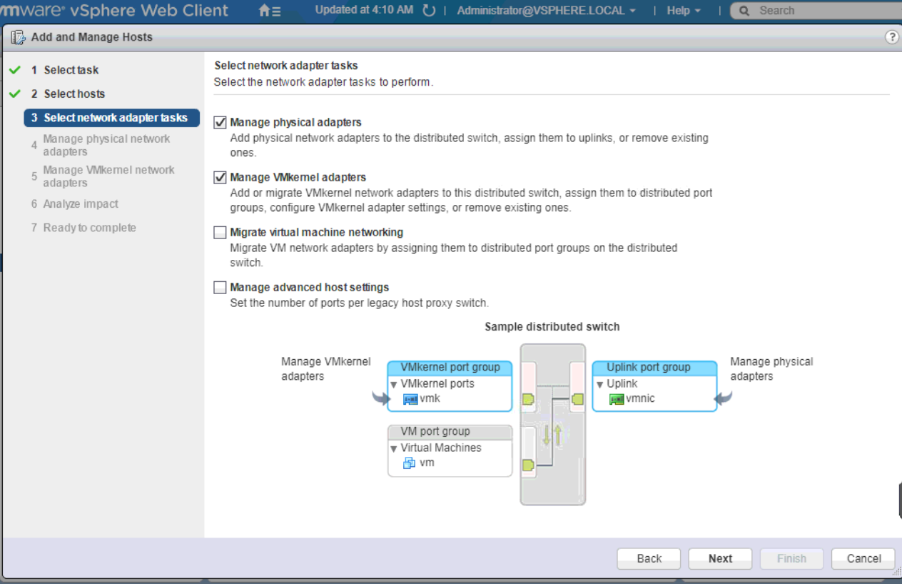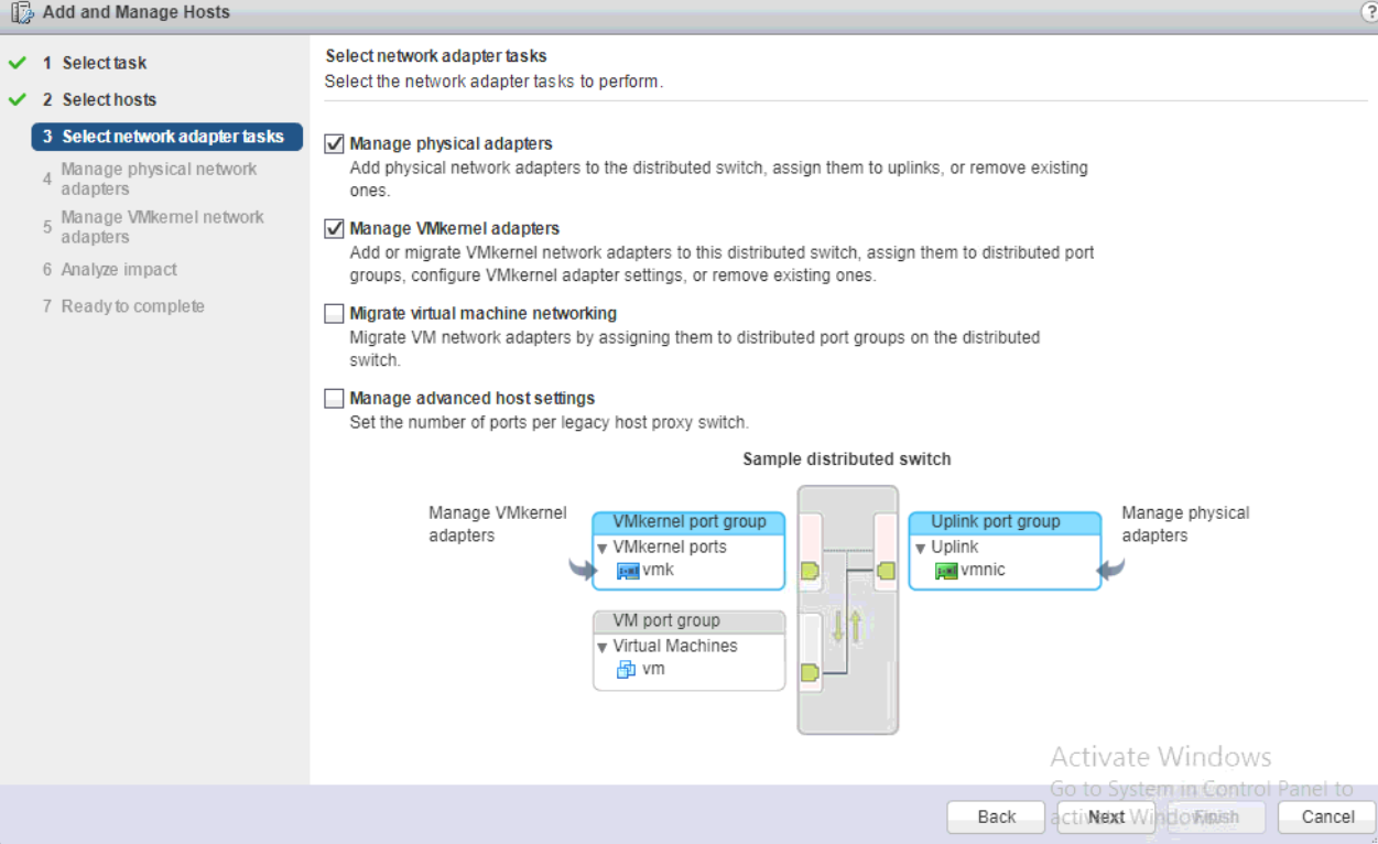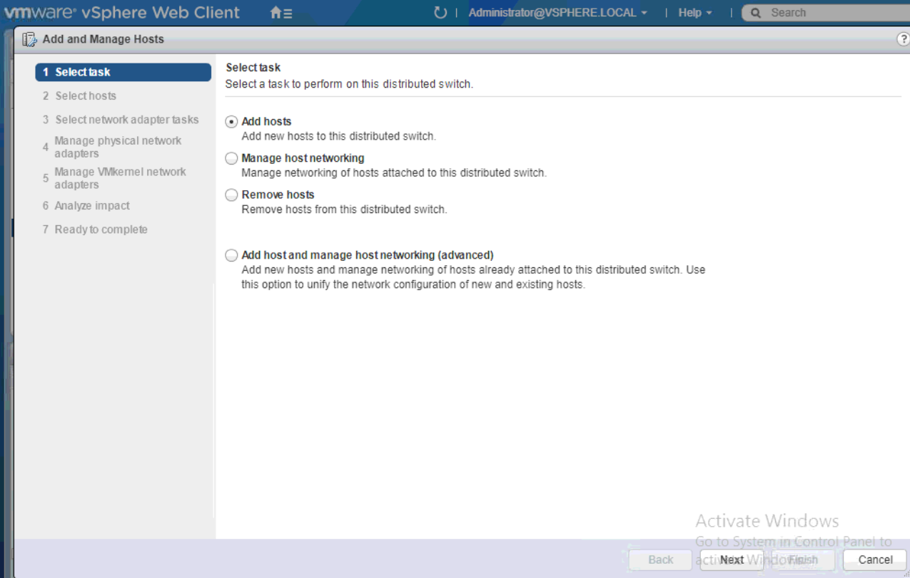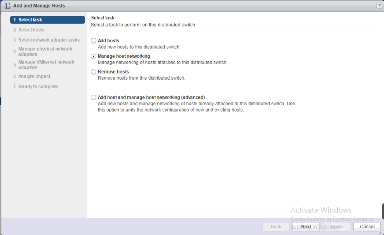 [Add and Manage Hosts]ウインドウが表示されるので、[1 Select task]にて[Manage host networking]を選択し、[Next]をクリックします。