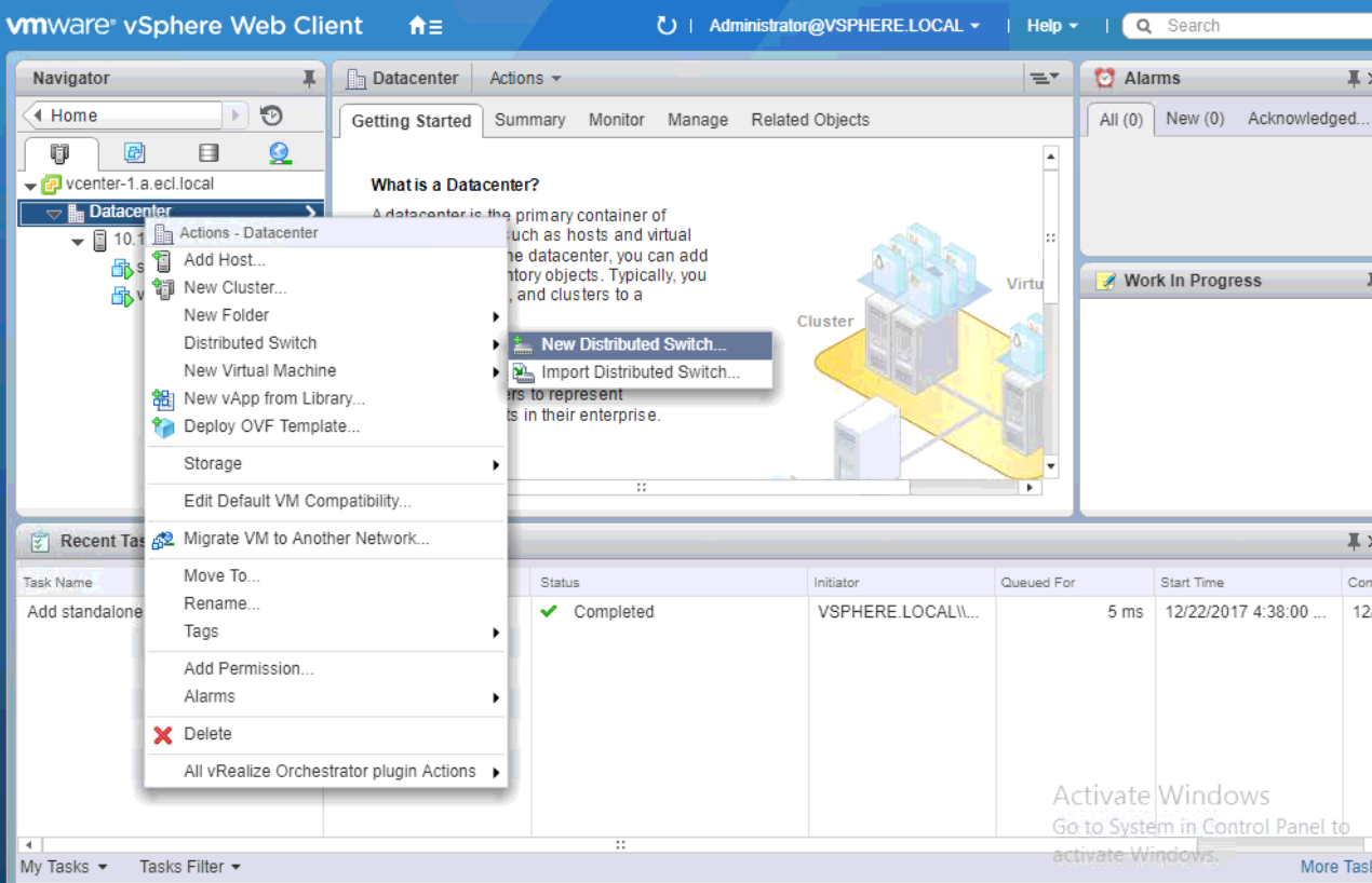 vSphere Web Client へログインし、左インベントリより、vCenterをクリックします。 インベントリより、[vCenter] > [Inventory Trees]配下の[Networking]をクリックします。 インベントリの[Datacenter]を右クリックし、[New Distributed Switch]をクリックします。