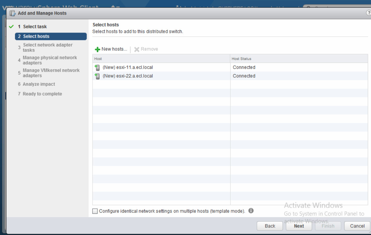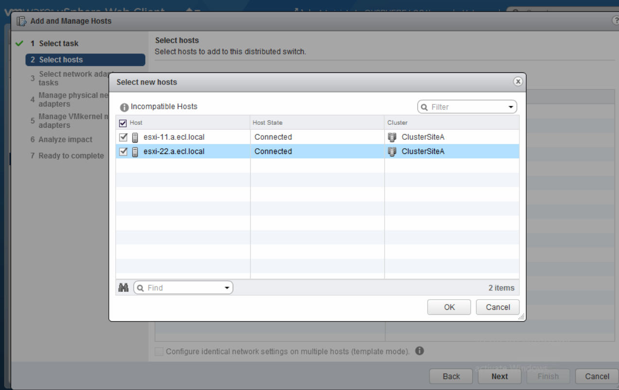 [2 Select hosts]にて、ESXiホストが追加されていることを確認し、[Next]をクリックします。