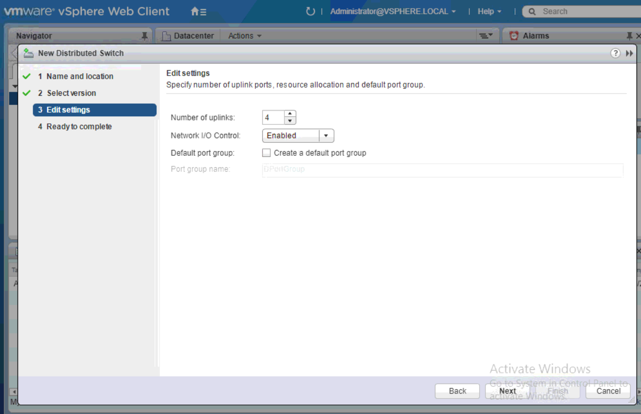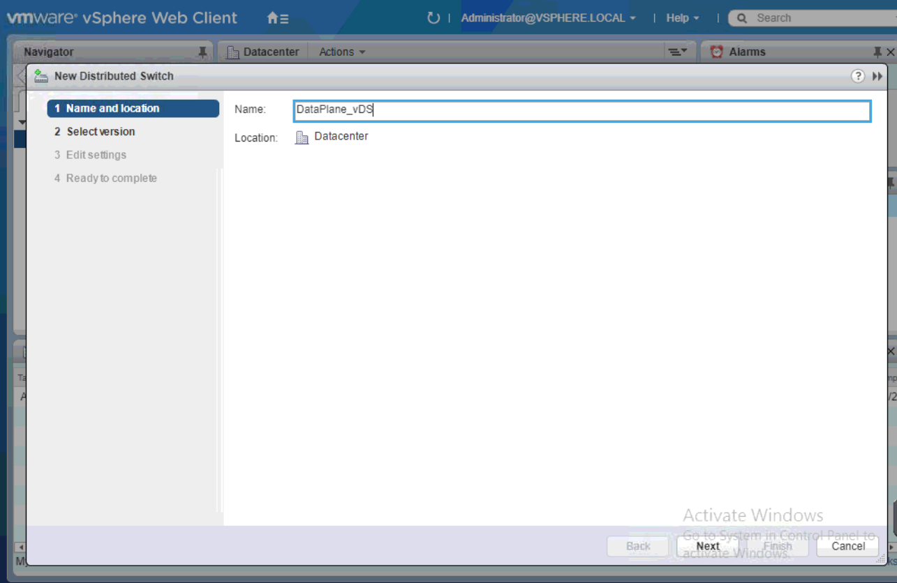 [New Distributed Switch]ウインドウが表示されるので[1 Name and location]にて、必要事項を入力し、[Next]をクリックします。