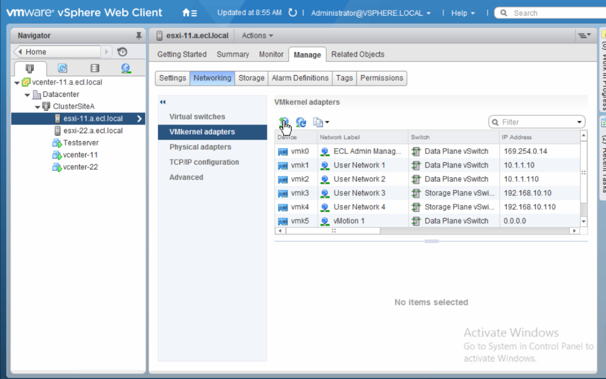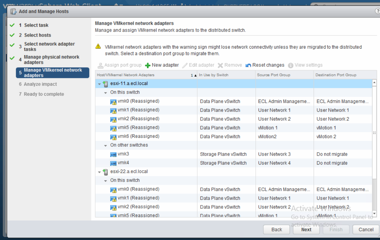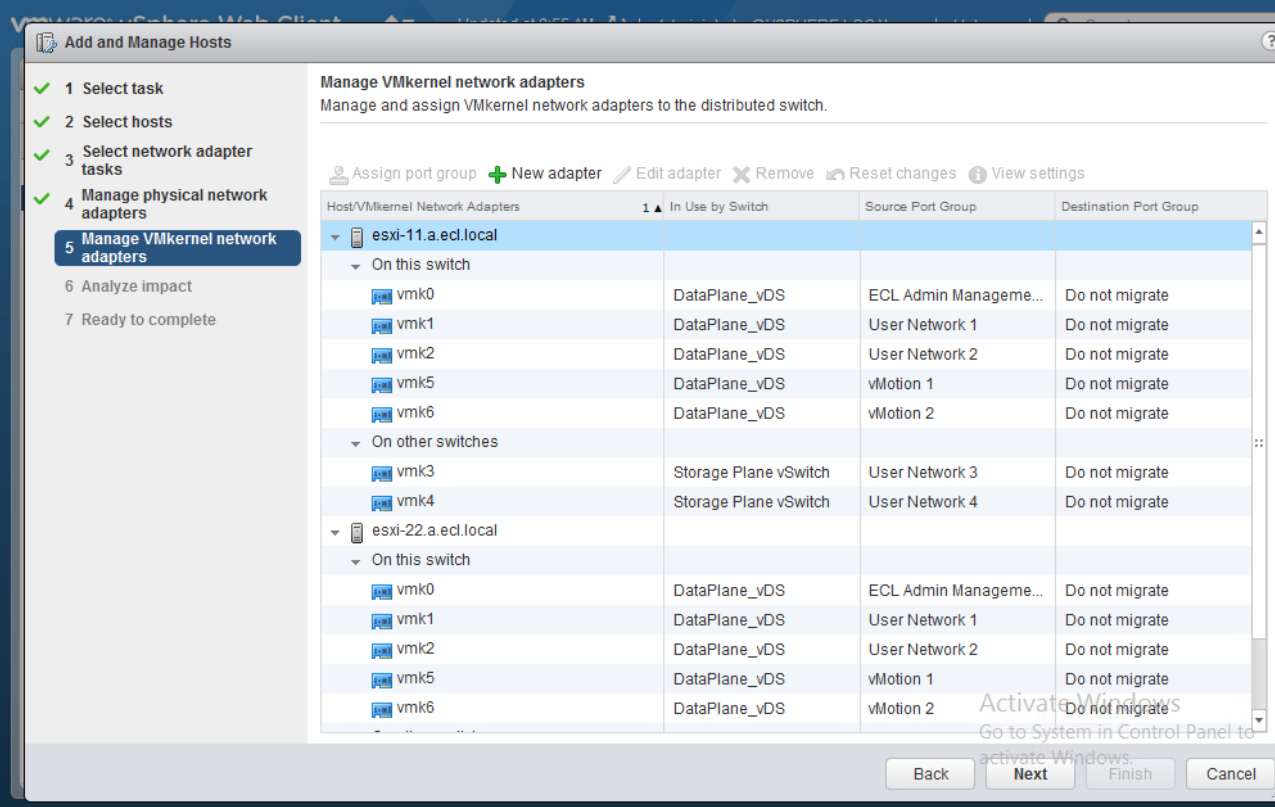 [5 Manage VMkernel network adapters]にて移行対象のVMkernelポートを選択し、[New adapter]をクリックします。