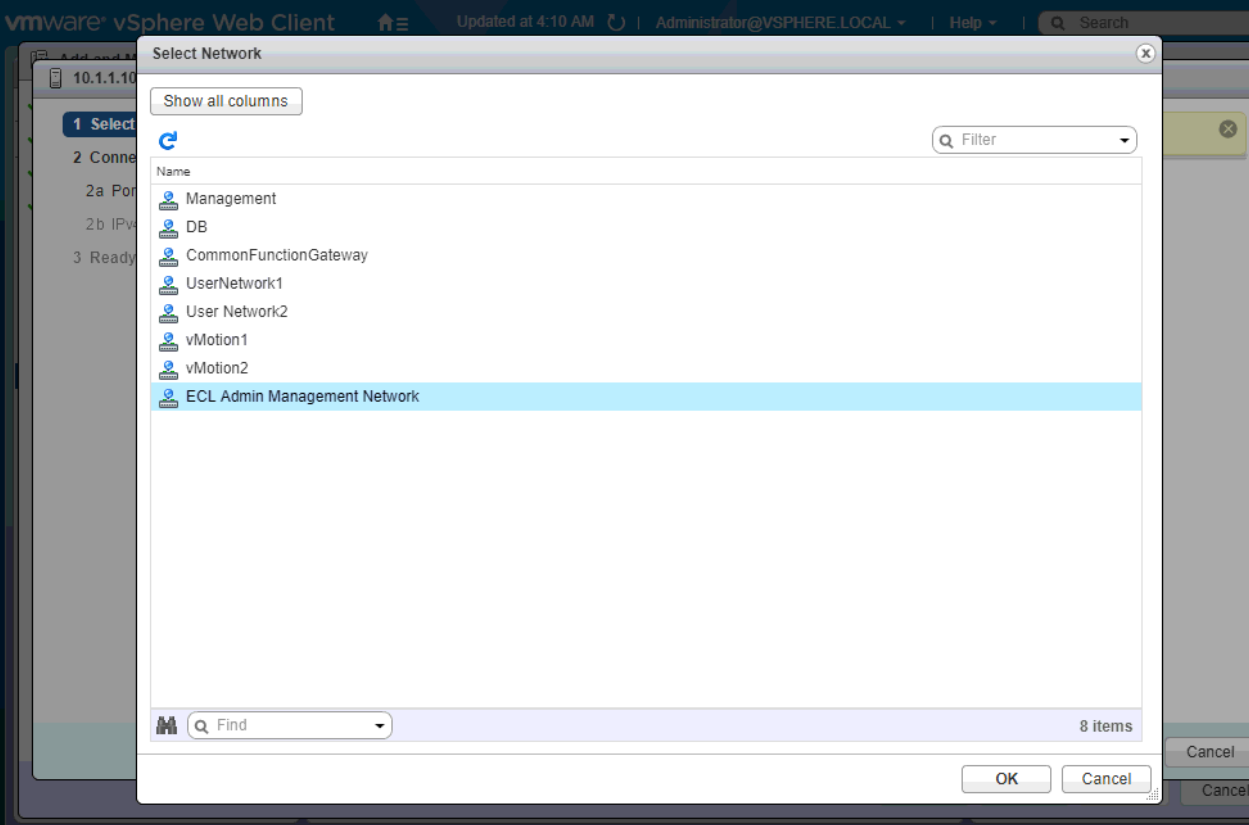 [Select Network]ウインドウが表示されるので、割り当て対象となるポートグループを選択し、[OK]クリックします。