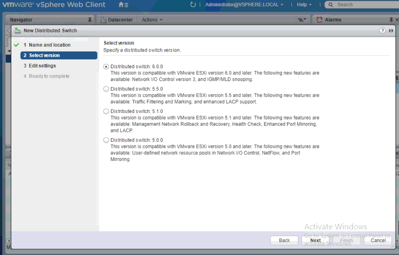 [2 Select version]にて、[Distributed switch: 6.0.0]を選択し、[Next]をクリックします。