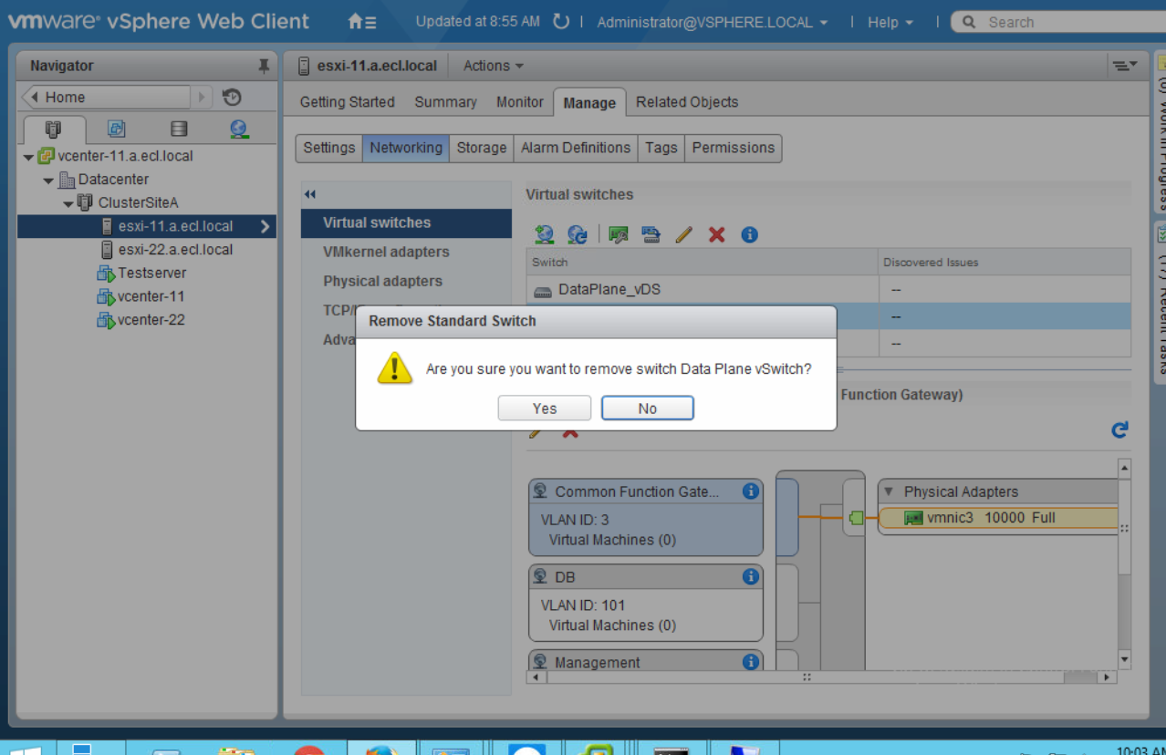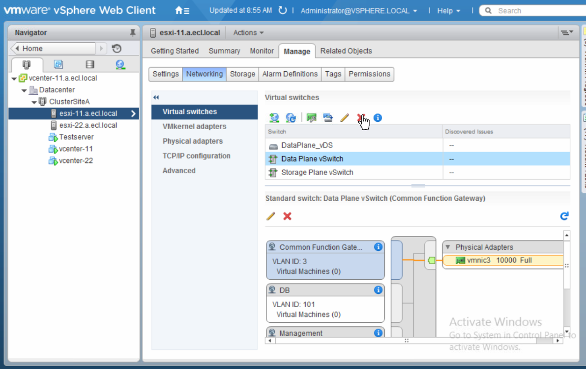 vSphere Web Client のインベントリより、[vCenter] > [Inventory Trees]配下の[Hosts and Clusters]をクリックします。 [Datacenter]配下の[vCenter-1.a.ecl.local]を選択し、中央ペインより[Manage]タブをクリックします。 [Manage]タブ内の[Networking] > [Virtual switches]をクリックします。 削除対象の仮想マシンスイッチを選択し、[Remove selected standard switch]をクリックします。