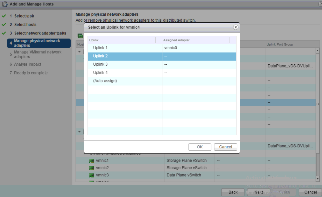 [Select an Uplink for vmnic]ウインドウが表示されるので、[uplink 2]を選択し、[OK]をクリックします。