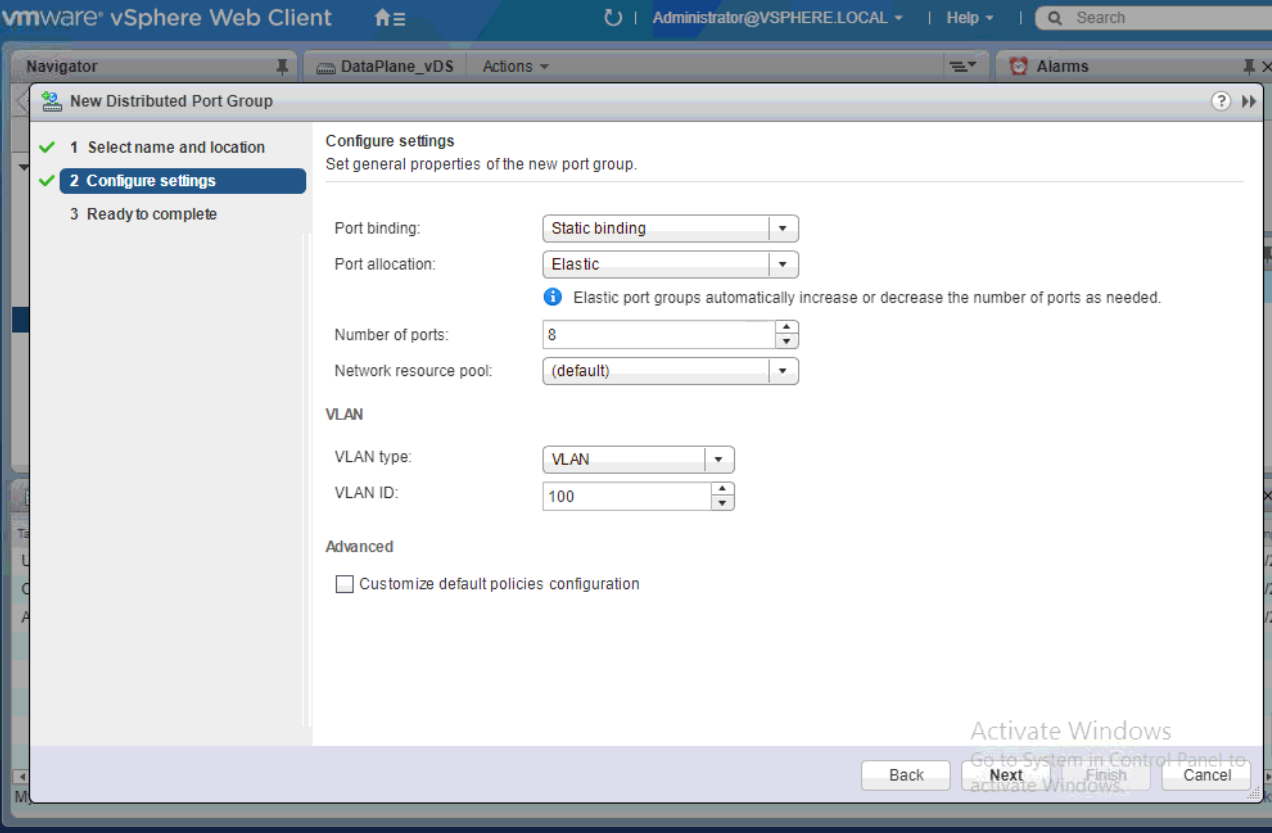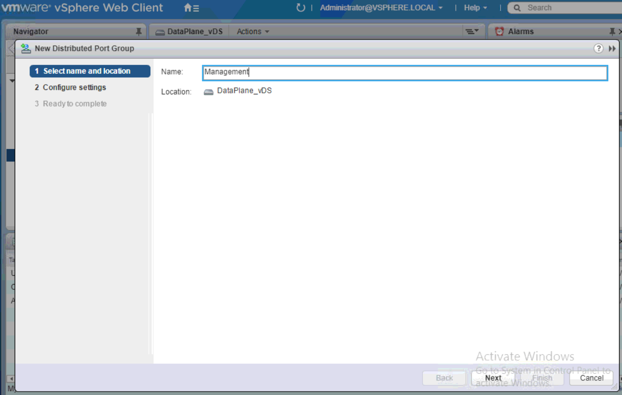 [New Distributed Port Group]ウインドウが表示されるので、[1 Select name and location]にて必要項目を入力し、[Next]をクリックします。