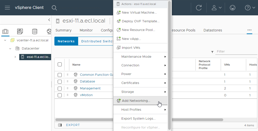 - vSphere Clientのインベントリから、[Home]>[Hosts and cluster]配下の対象ホスト(esxi-11)を選択します。右ペインから[manage]>[Networking]>[VMkernel adapters]と選択、[Add Networking]をクリックし、必要項目を入力して登録します。