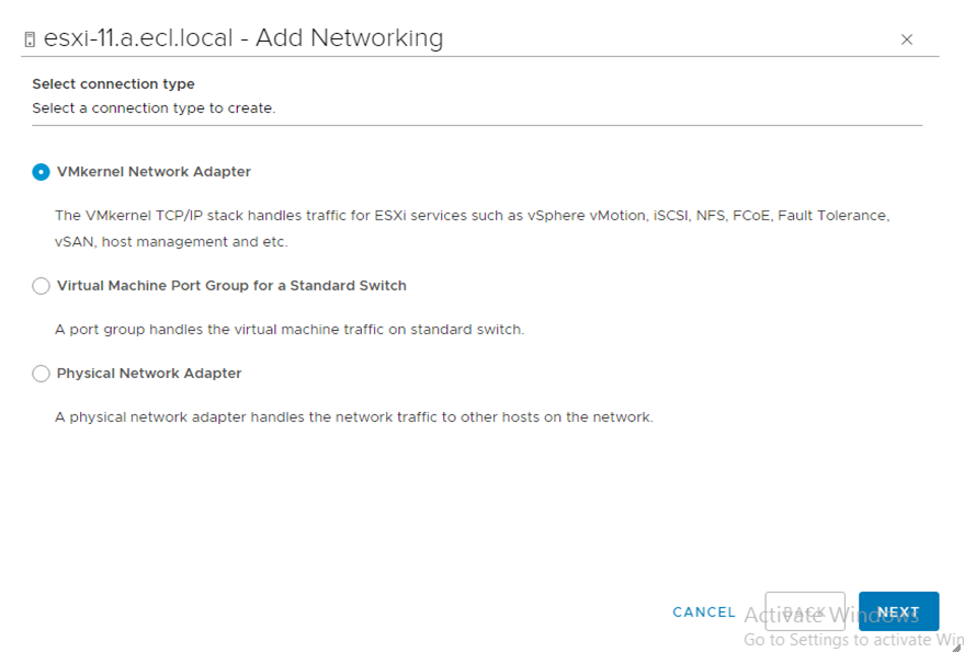 「Select connection type」にて[VMkernel Network adapter]を選択し、[NEXT]をクリックします