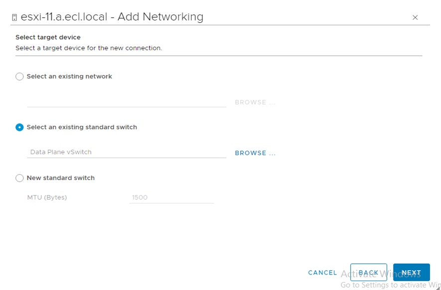 「Select target device」にて[Select an existing standard switch]>[BROWSE...]をクリックし、Data Plain vSwitchを選択後、[NEXT]をクリックします。