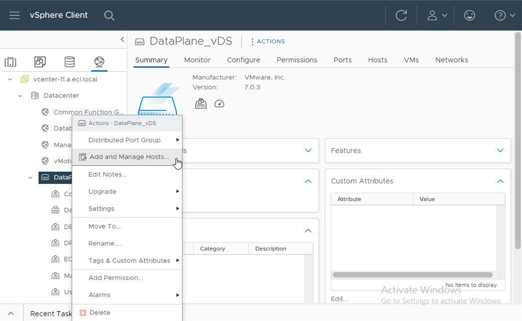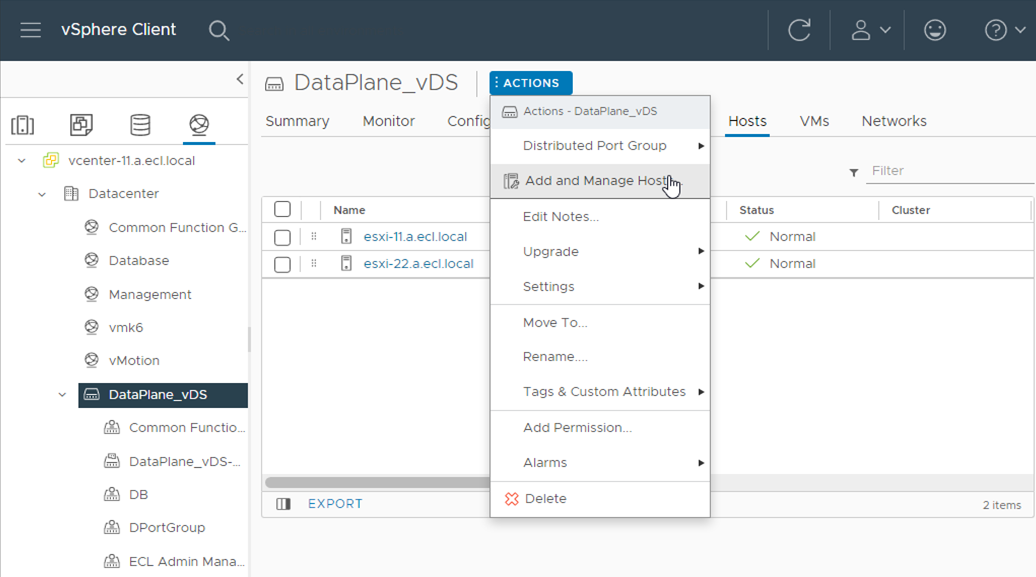 - vSphere Clientのインベントリから、[vCenter]>[Inventory Trees]配下の[Networking]をクリックします。作成したvDSを右クリックし、[Add and Manage Hosts...]をクリックします。