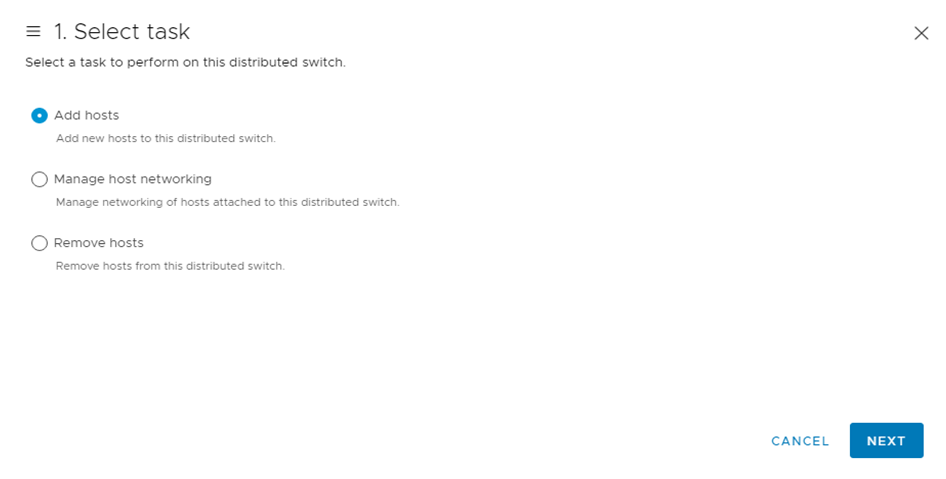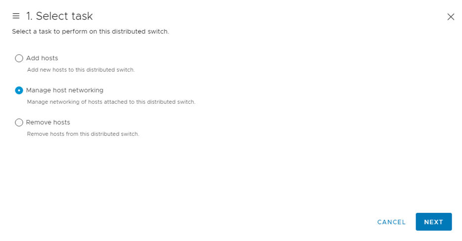 「Add and Manage Hosts」画面が表示されるので、「1 Select task」にて[Manage host networking]を選択し、[NEXT]をクリックします。
